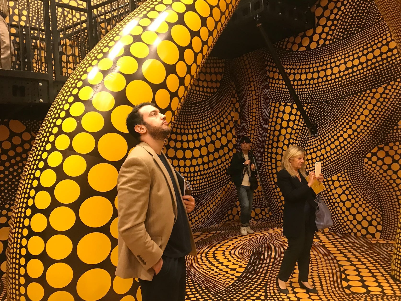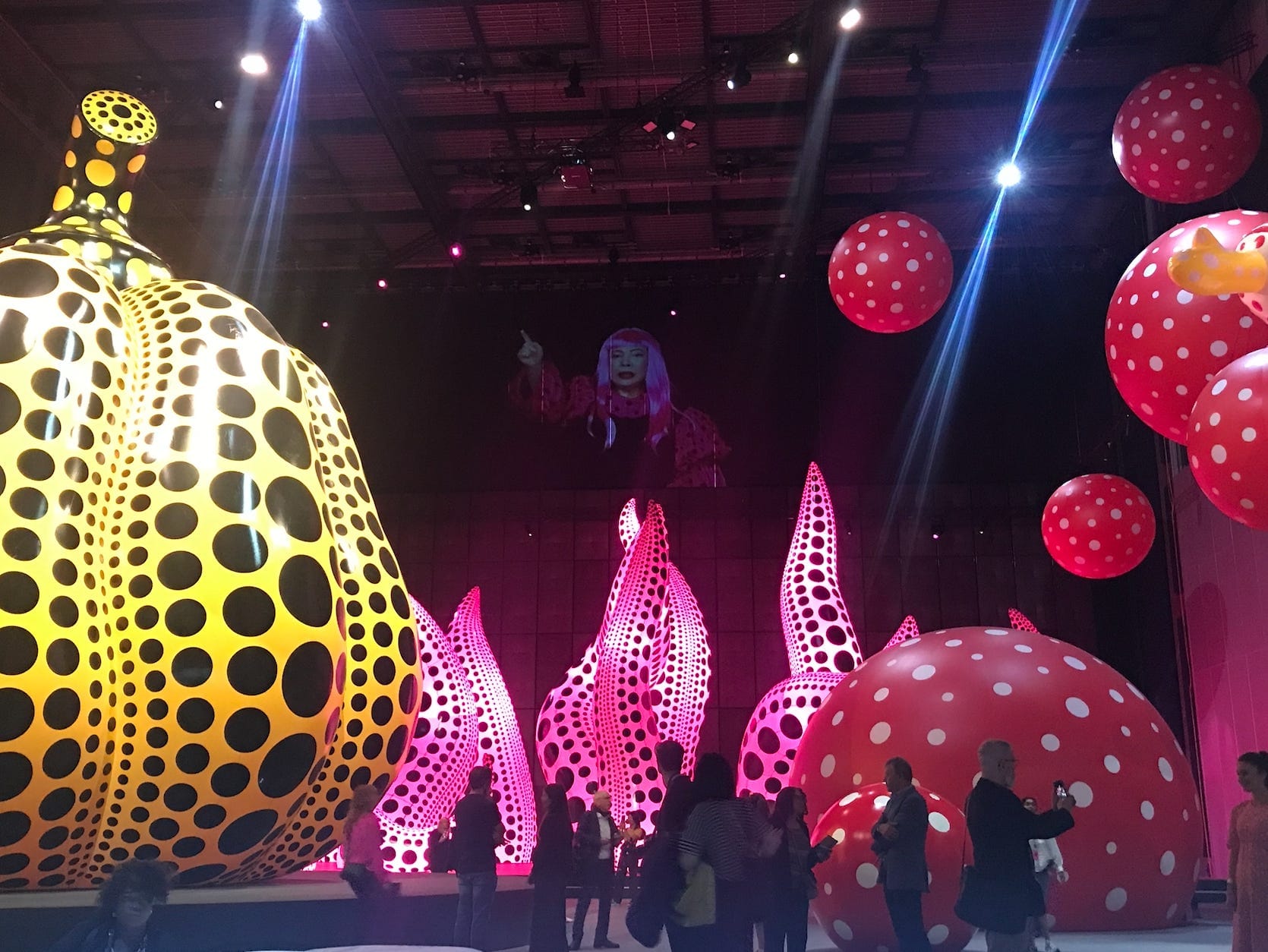 I have a brief chat with superstar curator Hans Ulrich Obrist, here to collaborate with Tino Sehgal and footballer Juan Mata on an artwork, then we’re ushered into the Yayoi Kusama exhibition, Me, You and the Balloons. This is what John has told me would be the one work to see if you don’t have time to see more than one piece. Kusama is in her nineties and makes strikingly accessible work, given its focus, about her life-long struggle with mental illness. There’s a long dark corridor and suddenly we’re spat out into Kusama’s world: a room of inflatable yellow sculptures with black polka dots, floor, ceiling, walls, all in the same pattern. Then you climb the stairs to a viewing gallery looking out over the most enormous room, filled with inflatables: an inflatable girl, the tentacles, her signature pumpkin, all with polka dots. You can descend to see it from floor level, and that’s more powerful. There are blow up clouds which you can lie on. It’s bracketed by a mirrored wall at one end of the exhibition and a video of Yusama talking in Japanese at the other.