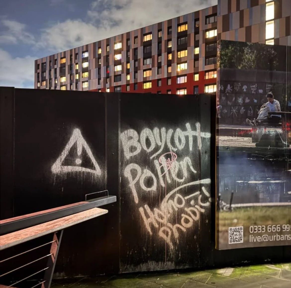 🧱 The mystery of Manchester’s vigilante vandalist thickens. Two days ago, yet another strange graffiti photograph appeared on Reddit, just a week after speculation about anti-White Hotel spray paint near Cheetham Hill Road. This time, the graffiti takes aim at Ancoats cafe Pollen, branding the bakery "Homo-Phobic". A few commenters on Reddit believe it must be the same person behind both, with one person even saying they came “face to face” with the alleged vandal the other day.