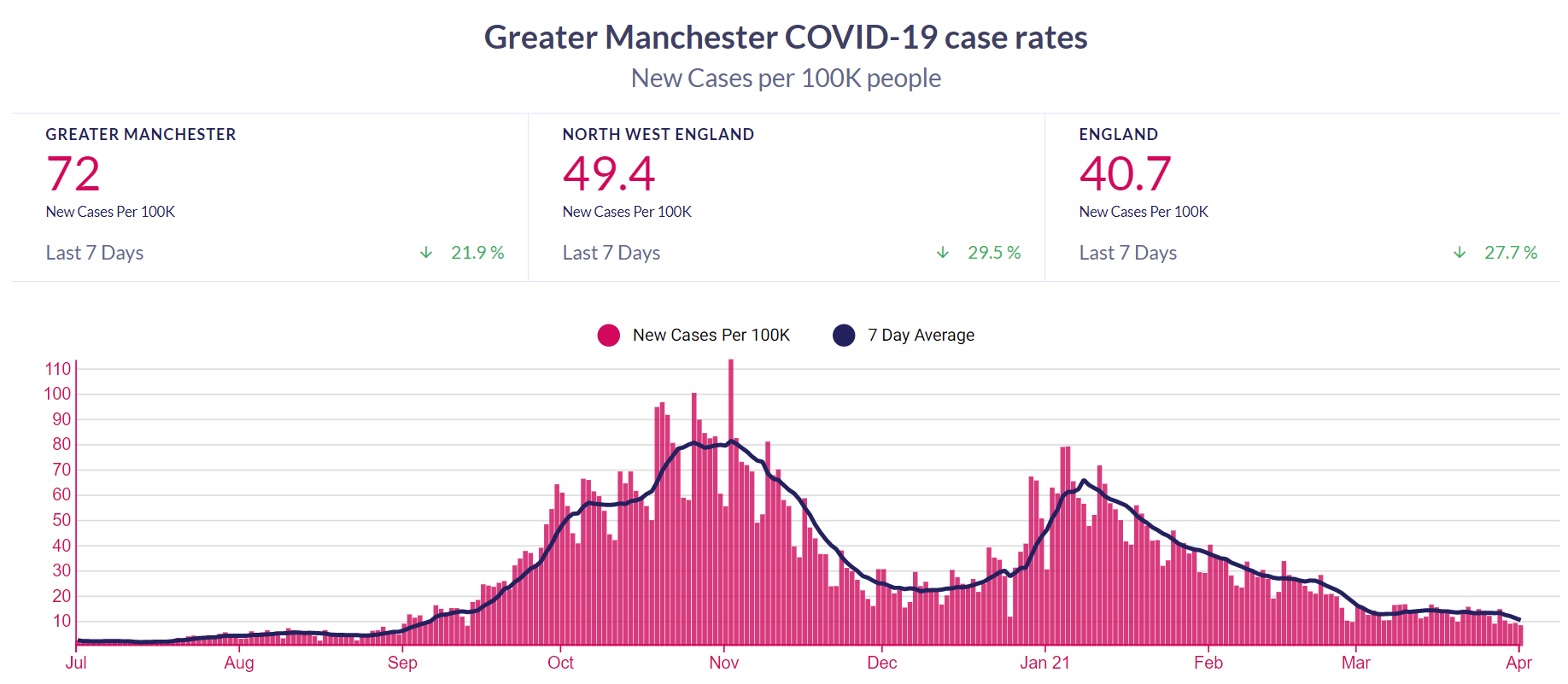- Case rates: There’s good news here — new confirmed cases are falling properly again, down 21.9% to a rate of 72 across GM in the past week. The rate across England is 40.7, down 27.7%. See our graphic below, made for us by our clever friends in California, HiGeorge.