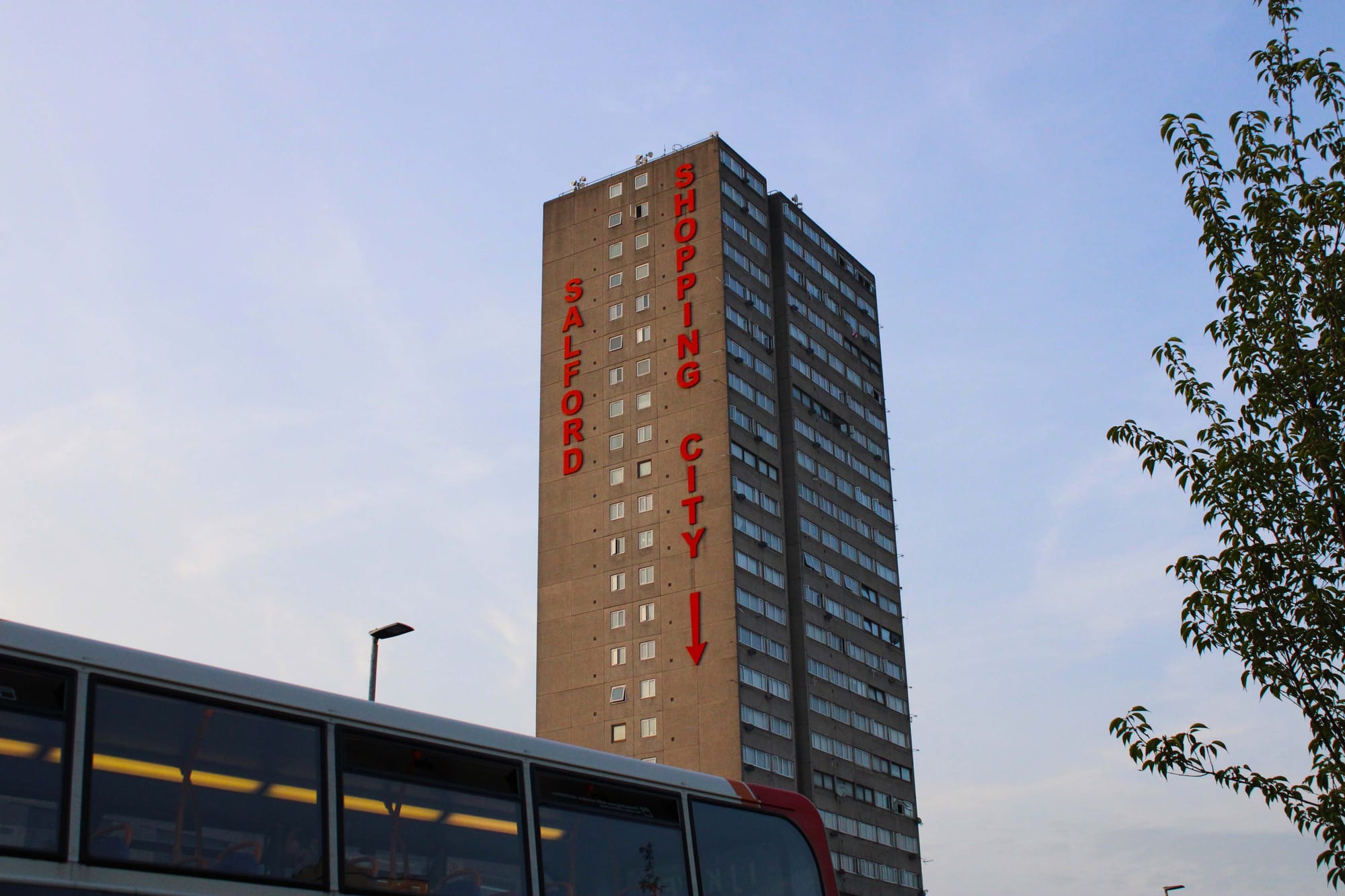 Today, the whole complex is the object of ridicule and disdain, a highly visible emblem of urban failure and neglect. Everyone in Salford knows it from the red lettering that tumbles down two of its sides. SALFORD SHOPPING CITY, it booms, with an arrow pointing down.