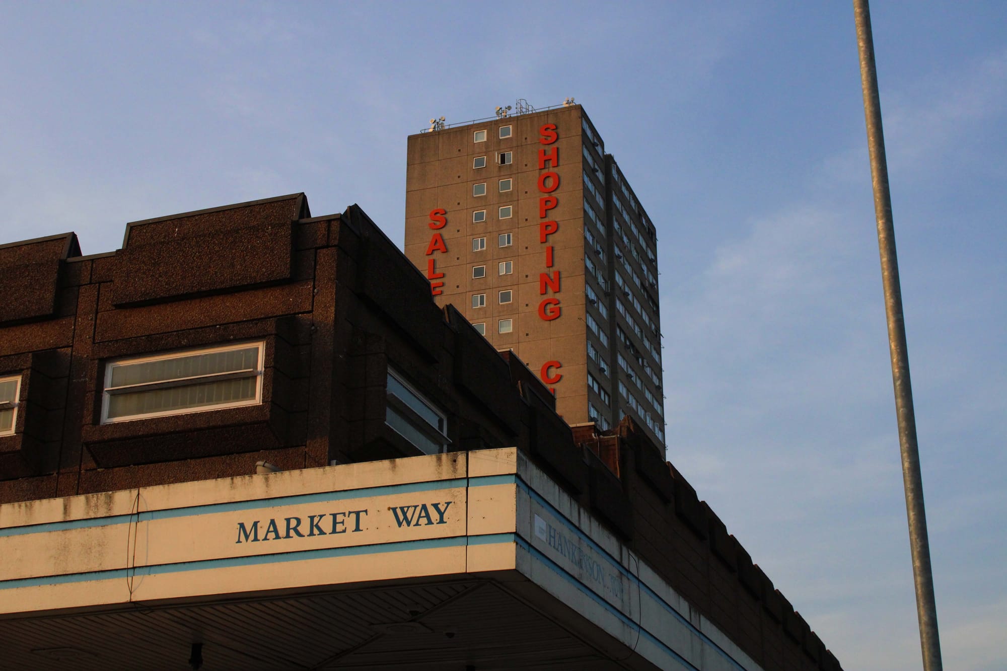 Staff chat in the middle of the walkways, leaning on mops and buckets. The centre is near enough empty. Silent except for the metallic crunch of a heavy security door closing, as tenants pass in and out of Briar Hill Court — the 250ft tower block driven through the middle of the centre like a stake, its entrance slotted in between two retail units.