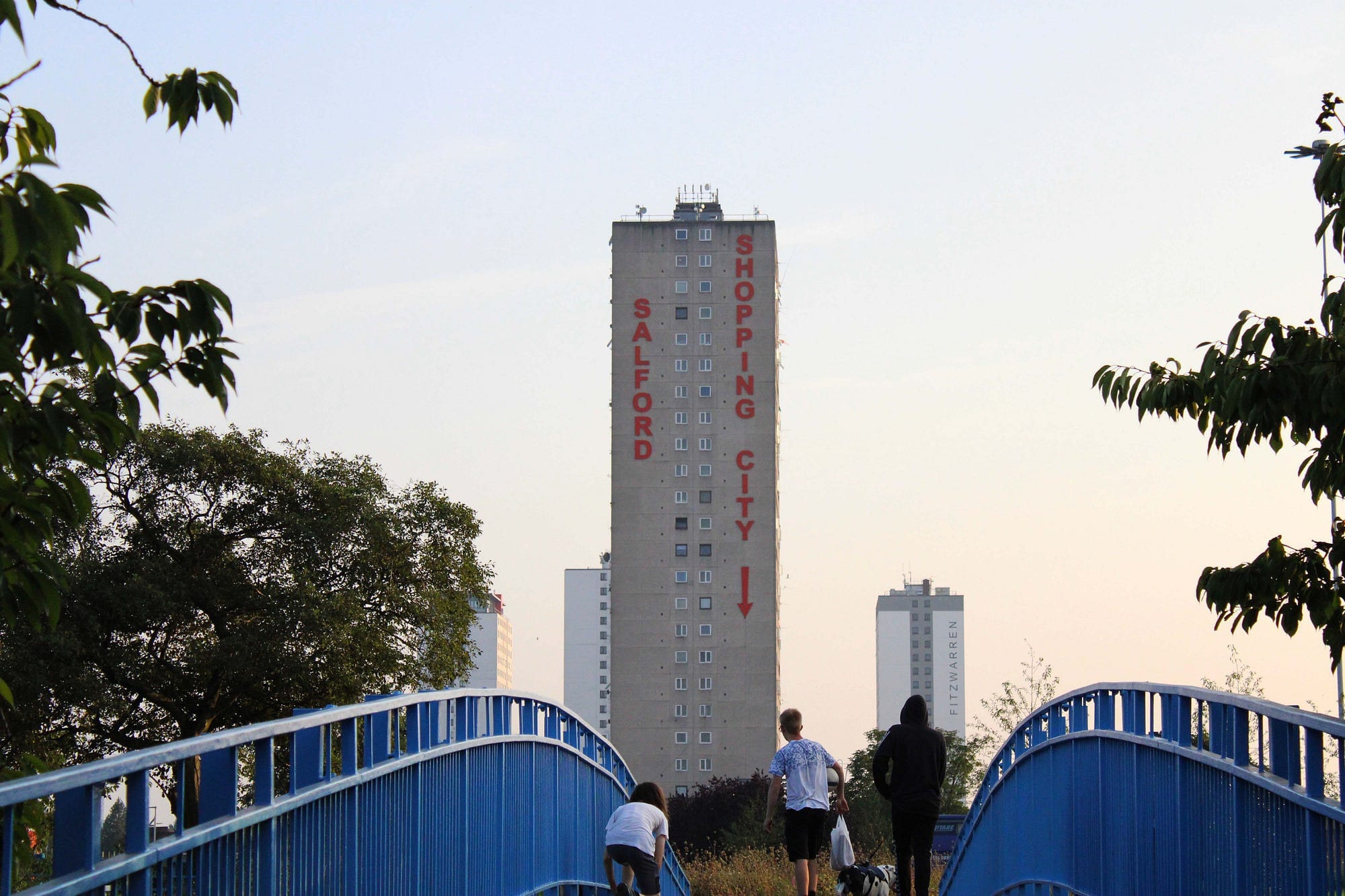 Today, the whole complex is the object of ridicule and disdain, a highly visible emblem of urban failure and neglect. Everyone in Salford knows it from the red lettering that tumbles down two of its sides. SALFORD SHOPPING CITY, it booms, with an arrow pointing down.