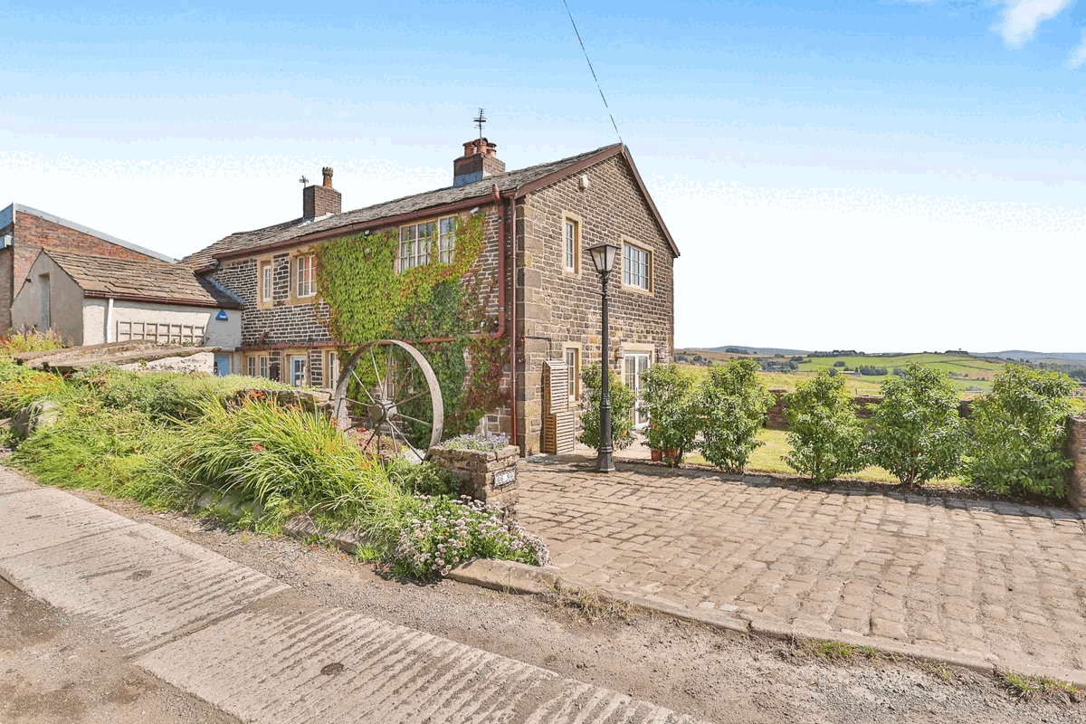 This cottage dates back to 1737 and has three bedrooms spaced over two floors, with one accessed via a private mezzanine, and French doors opening up to a beautiful garden with panoramic views of the Oldham countryside. £425,000.
