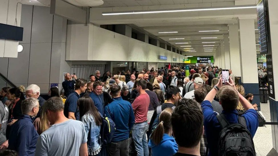 Top line: Manchester Airport reclaimed the crown of everyone’s least favourite over the weekend after a power cut at 4am on Sunday morning shut down its two busiest terminals, cancelling dozens of flights. Stranded passengers scrambled for Ubers to nearby airports so they could still get away, and those whose flights did take off went only with carry-on bags, because their hold luggage couldn’t be processed. Suitcases were left piled up at check-in gates.