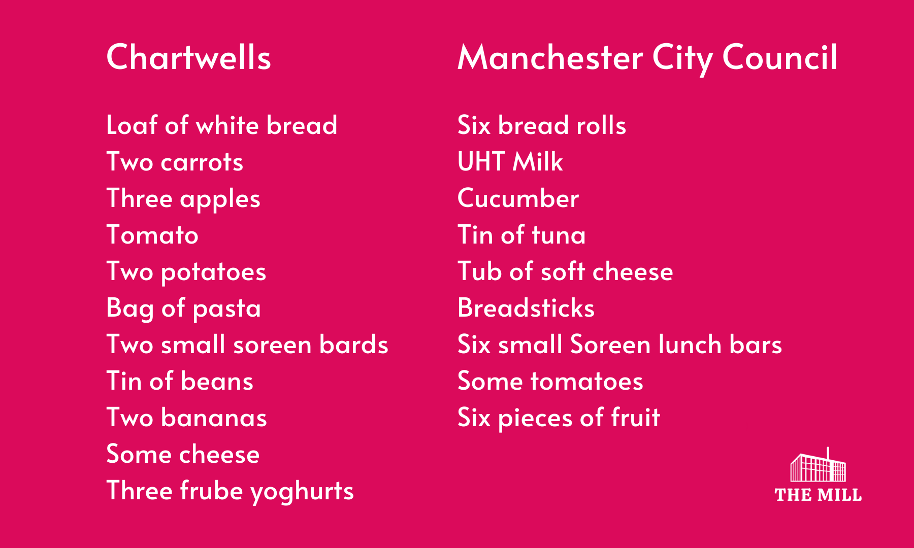 The parcels are supposed to give families who qualify for free school meals £15 worth of food to feed their child at home for a week. “I costed up the food parcels provided by Manchester Fayre and it was, at best, £7 per parcel,” the headteacher told The Mill.