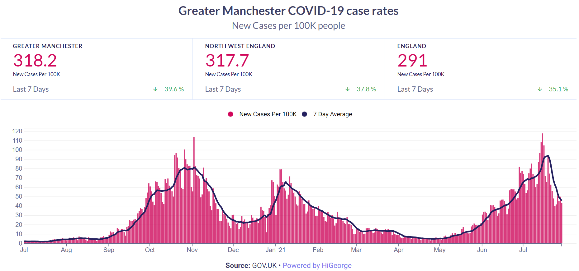 - Vaccinations: Almost 1.5 million people in Greater Manchester have now had two doses of a Covid-19 vaccine, or just over 60% of adults. 92% of over-70s have received their second dose, 84% of 50-69s and 42% of 18-49s. These figures were updated last week and you can find them in full here.
