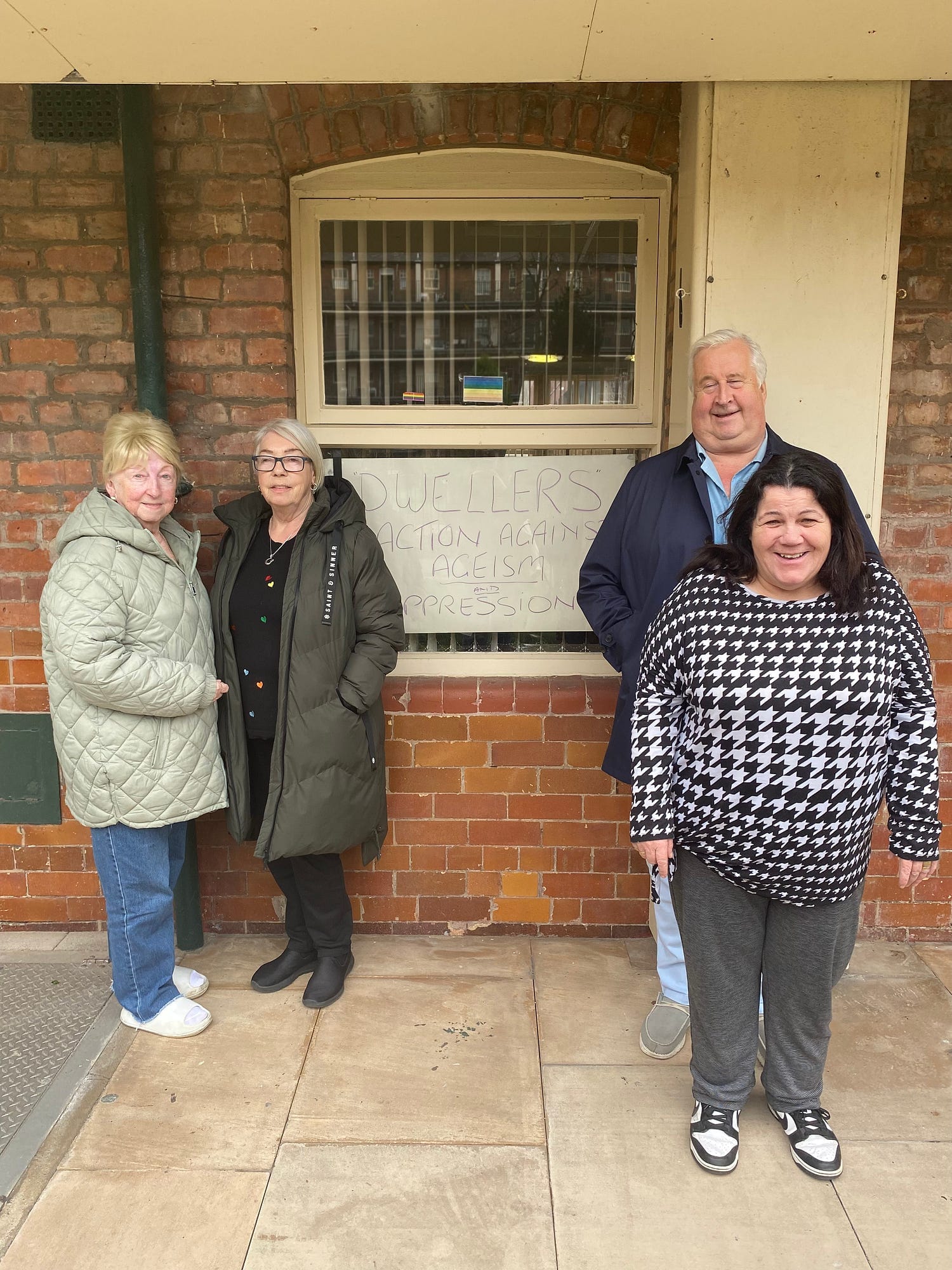 Since the letter last Friday, a handful of residents calling themselves “The Dwellers” have made their way back into the community room and staged a sit-in protest. Josie Loftus, a blonde 79-year-old, along with Angela Robinson and friends Chris Holgate, Bridget Doherty and Stella Hollingworth have been sleeping in armchairs, occasionally leaving the scene to buy sandwiches and doughnuts or to catch up on sleep. They say their aim is to secure access to the community room 24/7, but they also say they are fighting against “ageism and oppression”.