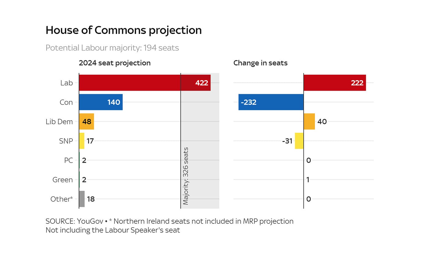 With a month until the General Election, it’s been a busy day of political news. First Nigel Farage announced that he is going to contest a seat at the election and has taken over the leadership of his Reform party, potentially a significant blow to the Conservatives. Then a big election projection published by Sky News showed that Labour could be on course for a massive landslide victory — we’re talking the most seats won by any party since 1924.