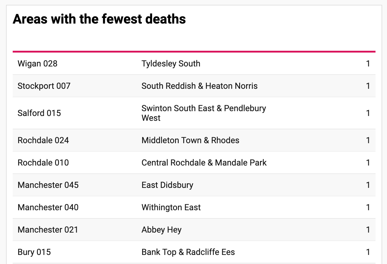 You should know: Deaths are counted if COVID-19 was considered the underlying cause or was mentioned on the death certificate as a contributory factor. And the data is broken into small, comparable geographical units with similarly sized populations, like Withington East in Manchester, with about 8,500 residents. Use the map here.