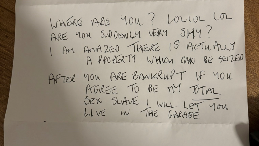 In August 2024 — a few weeks after sending an email outlining his intention to “examine [Cloake’s] mouse hole properly” — Andrew Milne showed up at Cloake's front door. By this point Cloake had already declined his offer to purchase copyright to material about Milne posted on the blog page (presumably to give himself control over what was being published about him). Cloake was out, but Milne proceeded to scribble a note on a bin, which was then pushed through the door. The note was a threat to have Cloake’s property seized, followed by an even stranger threat: