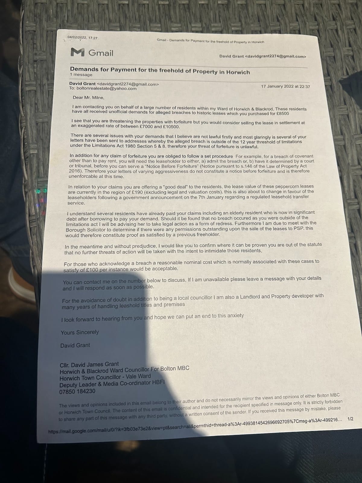 It could happen to anyone of course. A few light ales, a bit of harmless online bidding and voilà, you’ve woken up with a sore head as the “principal landed proprietor” (his words) in a small town near Bolton. But what happened next was more concerning: from 2021 Milne proceeded to launch a multi-year campaign of demands to make the residents of Horwich buy the freeholds from him for thousands of pounds. If they didn’t comply, the threats would begin. Threats to knock down their conservatories; threats to have the leases on their homes forfeited; threats to take them to court.