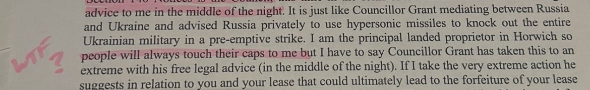 Then Milne deployed an analogy. Grant was like a mediator in the Russia-Ukraine war, but he had “advised Russia privately to use hypersonic missiles to knock out the entire Ukrainian military in a pre-emptive strike”. What he meant here was that councillor Grant had advised him on the action he needed to take to start the process to forfeit the leases for anyone who was in breach of them, so that he could take their homes. He was Russia, they were Ukraine, and he was coming for their land.