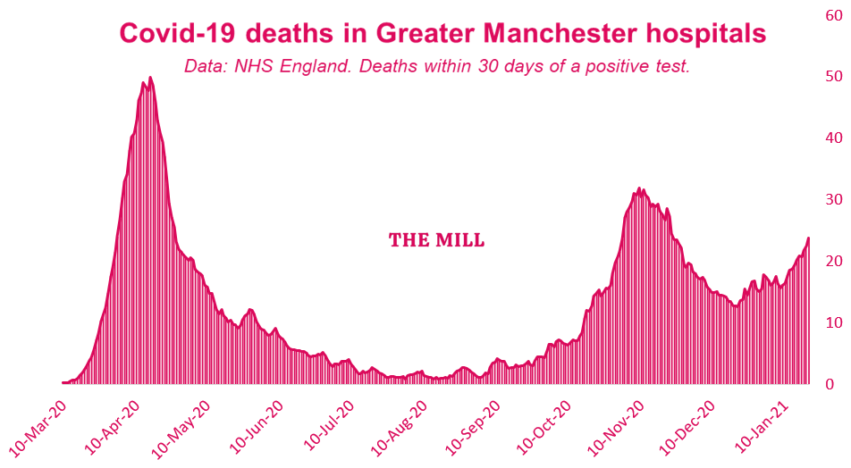 Will it rise further? Yes, probably, because hospitalisations are still very high. As of last Wednesday, there were 157 patients who had tested positive for the virus in critical beds in GM hospitals, up from 138 the week before. That’s very close to the November peak of 160 in critical care.