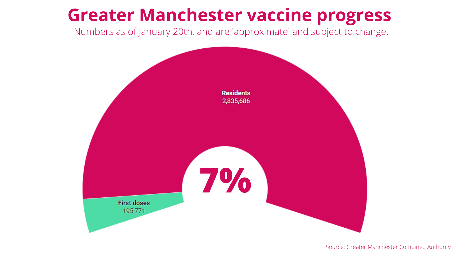 Vaccinations continue apace. Nationwide, 478,248 people got their first dose in the 24 hours to Saturday, a daily record. We only get the local figures weekly when they are released by the Greater Manchester Combined Authority, but last Wednesday we told you that 7% of GM residents had received their first dose, matching the national rate of progress at that point (also 7%).