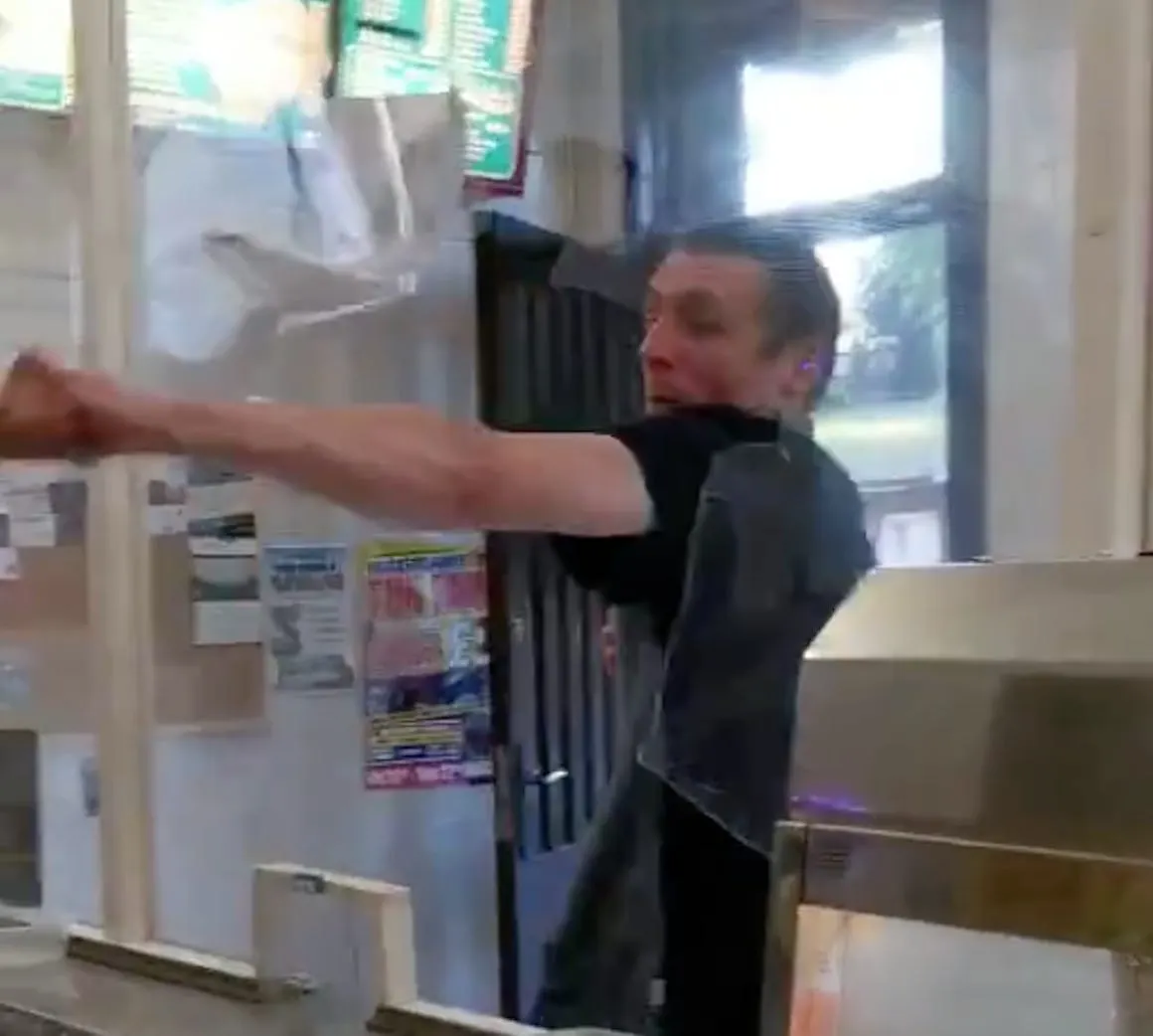 There’s a video blowing up on Twitter, showing a man smashing up a Chinese takeaway, seemingly terrorising the staff by punching violently through the perspex counter screen. It’s a terrifying clip, and unusual for having been shot from behind the counter, so you can see the man’s face very clearly as his fist repeatedly shatters bits of the plastic separating the shop’s staff from customers.