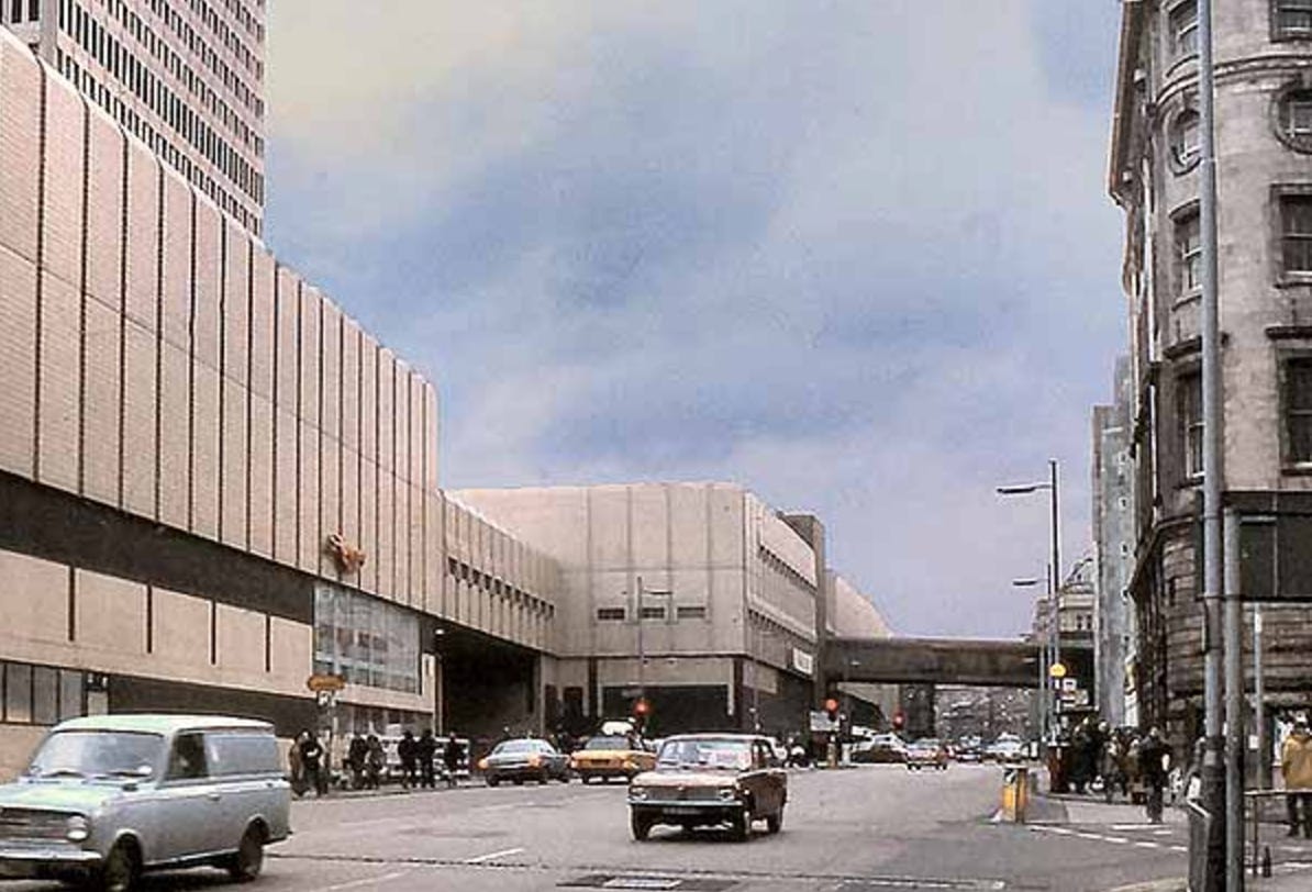 The retail centre of gravity would eventually shift northwards — in part due to the appeal of the posh department store Kendal, Milne and Faulkner (later known just as Kendals and now part of House of Fraser), which anchored itself on Deansgate. This would be bolstered by Marks and Spencers opening a large store at the bottom of Market Street, meaning the corner of Oldham Street and Market Street was no longer the heart of the city’s retailing, but the edge. The department stores on Oldham Street closed and the Woolworth on Piccadilly burnt down in a tragic fire in 1979, explaining why the council were so keen on redeveloping the northern side of Market Street.