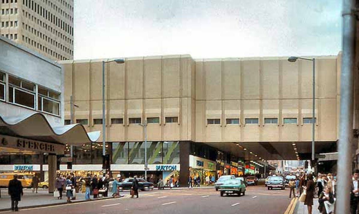 The Arndale managed to be both an anomaly — it was far more ambitious than any other shopping centre being built in the North at the time — and consistent with the national picture. In Alistair Kefford’s The Life and Death of the Shopping City, the former UoM history lecturer details the unstoppable rise of retail chains (as opposed to individual traders) in post-war Britain. He explains how in the 50s, there were a few retail chains in Britain boasting over a hundred stores, whereas by 1970, “multiple retailers had captured something like 40 per cent of the total retail trade.” He describes individual shops being gradually replaced from the 60s onwards by different types of “holistically planned” shopping centres. The Arndale Centre would be one of their number. And it’s easy to see the practical argument for it — the retail chains that gained ground in the 60s and 70s like Topshop wanted big units, high ceilings, lots of space. They didn’t fit easily into old buildings.