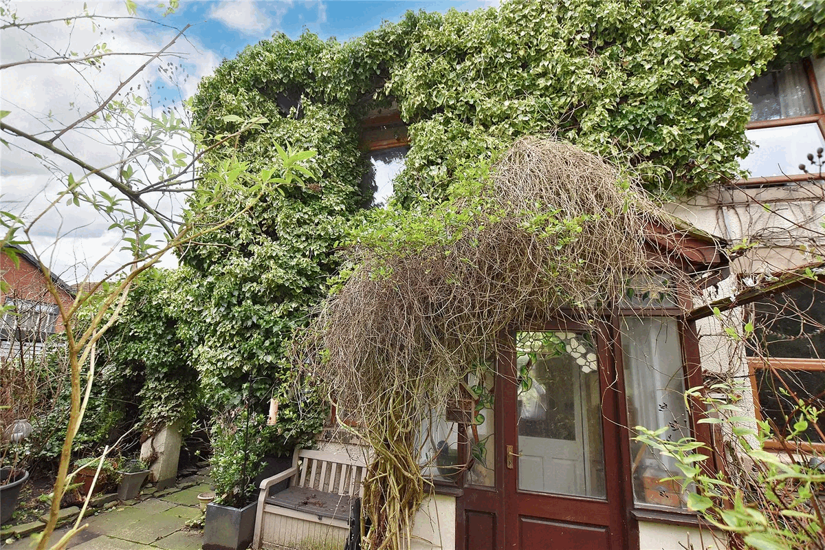 This leafy three-bedroom end-of-terrace in Oldham has stained glass windows, exposed brick and a large garden. £185,000.