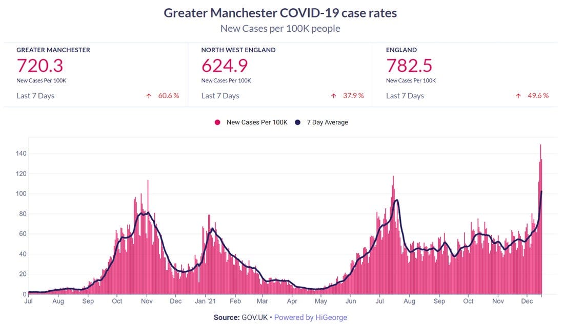 The numbers: The latest GM case rate is now 720.3, up 60.6% on the previous week, and it’s clearly going to rise much higher in the days ahead. Look at those pink bars on the very right-hand side of the dashboard showing massive sets of new positives on Tuesday, Wednesday and Thursday last week. The rate across England is a bit higher, at 782.5, up just under 50% in a week.