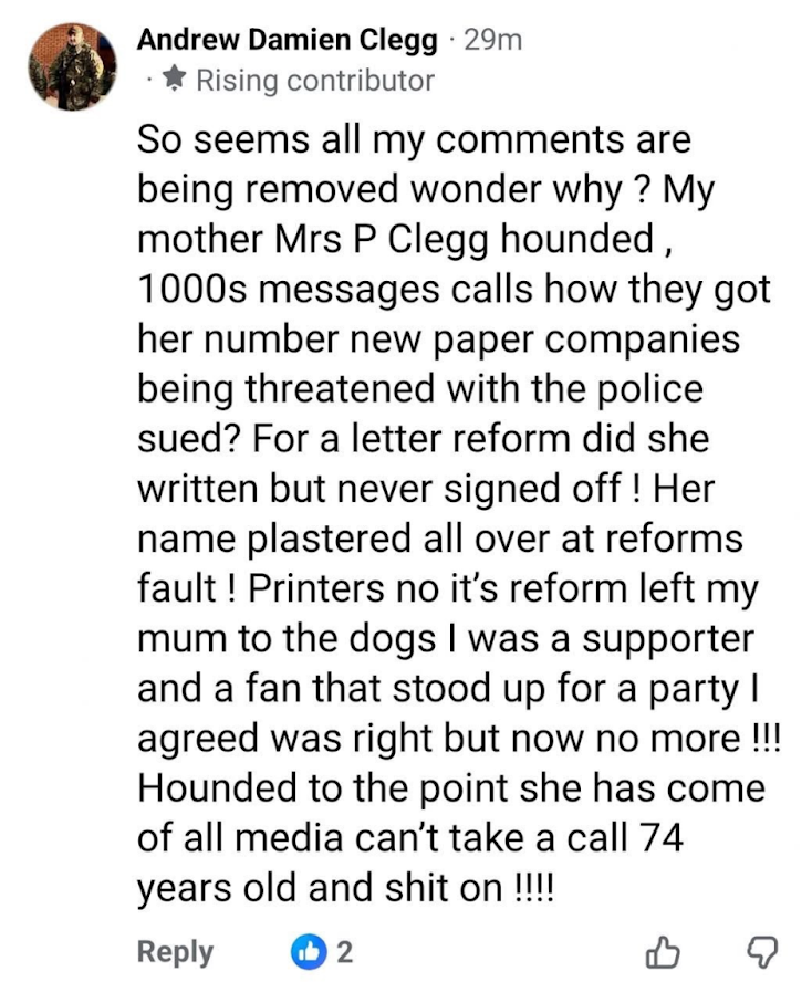 In an outraged comment on one of Matt Goodwin’s Facebook posts, Clegg claims that his mother never signed off on the letter. He says that Reform tried to blame the printers, but it’s actually Reform’s fault, who he says “left [his] mum to the dogs”. He also says that all his previous comments on the subject had been mysteriously “removed” (we asked Matt Goodwin’s team if they’d been deleting Clegg’s comments from below Goodwin’s Facebook posts, but they ignored the question).