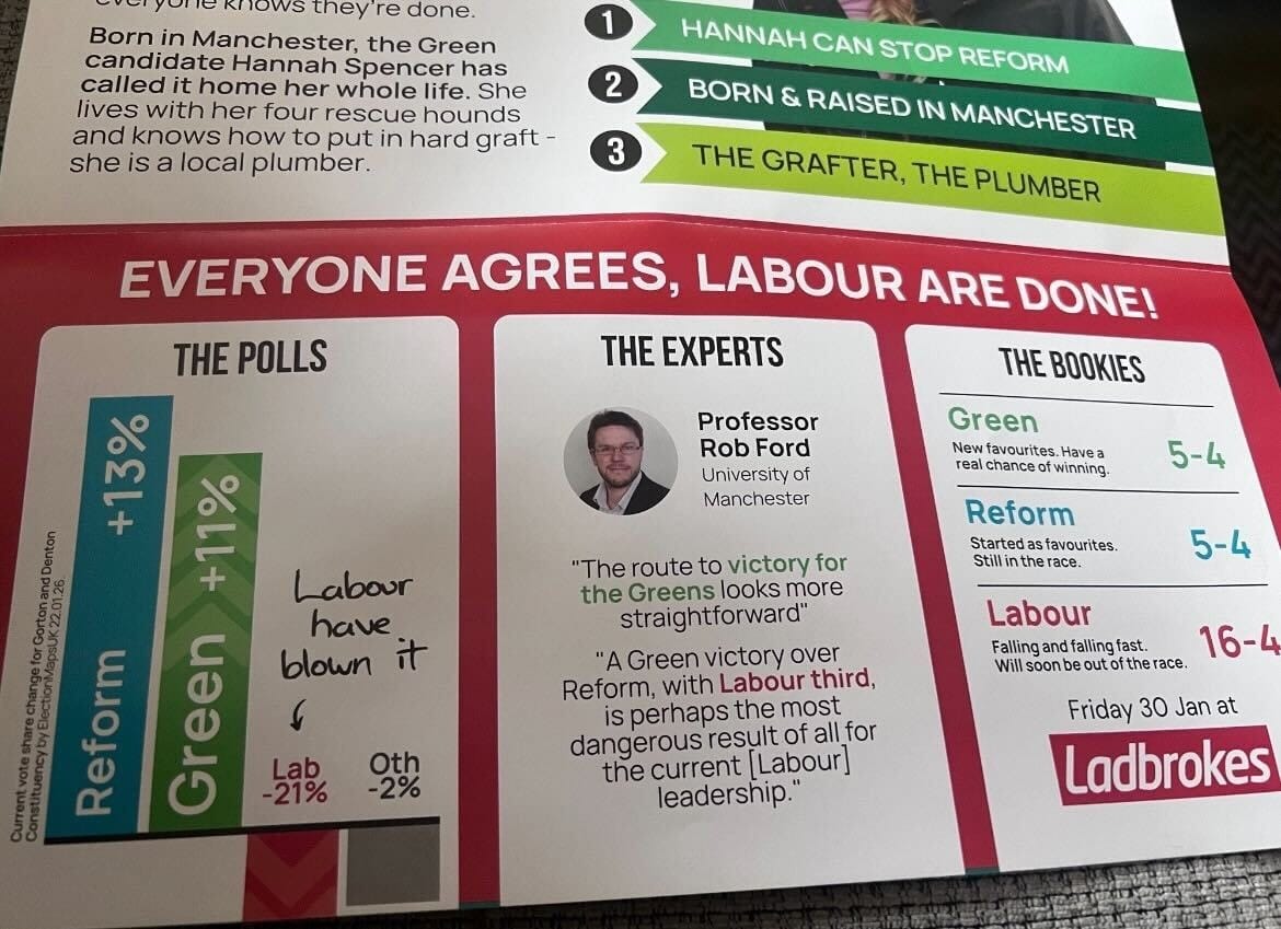 And Reform isn’t the only party who’ve found themselves in hot water over campaign letters in Gorton and Denton. Robert Ford, a political scientist at the University of Manchester, says he’s lodged an official complaint with a returning officer over the use of his quotes in Green party leaflets. When Ford wrote a great article about the upcoming by-election, he wasn’t expecting to find quotes from it, alongside his face and name, published on Green party letters in a way he claims misrepresents his views. That was last week, and Ford clarified at the time that he hadn't endorsed their campaign and contacted the party; Greens said it was an oversight on their part and one that wouldn’t happen again. But now Ford is alleging that “despite personal assurances to the contrary”, the Greens have “misrepresented” him on a second leaflet, and he’s escalating the matter via an official complaint.