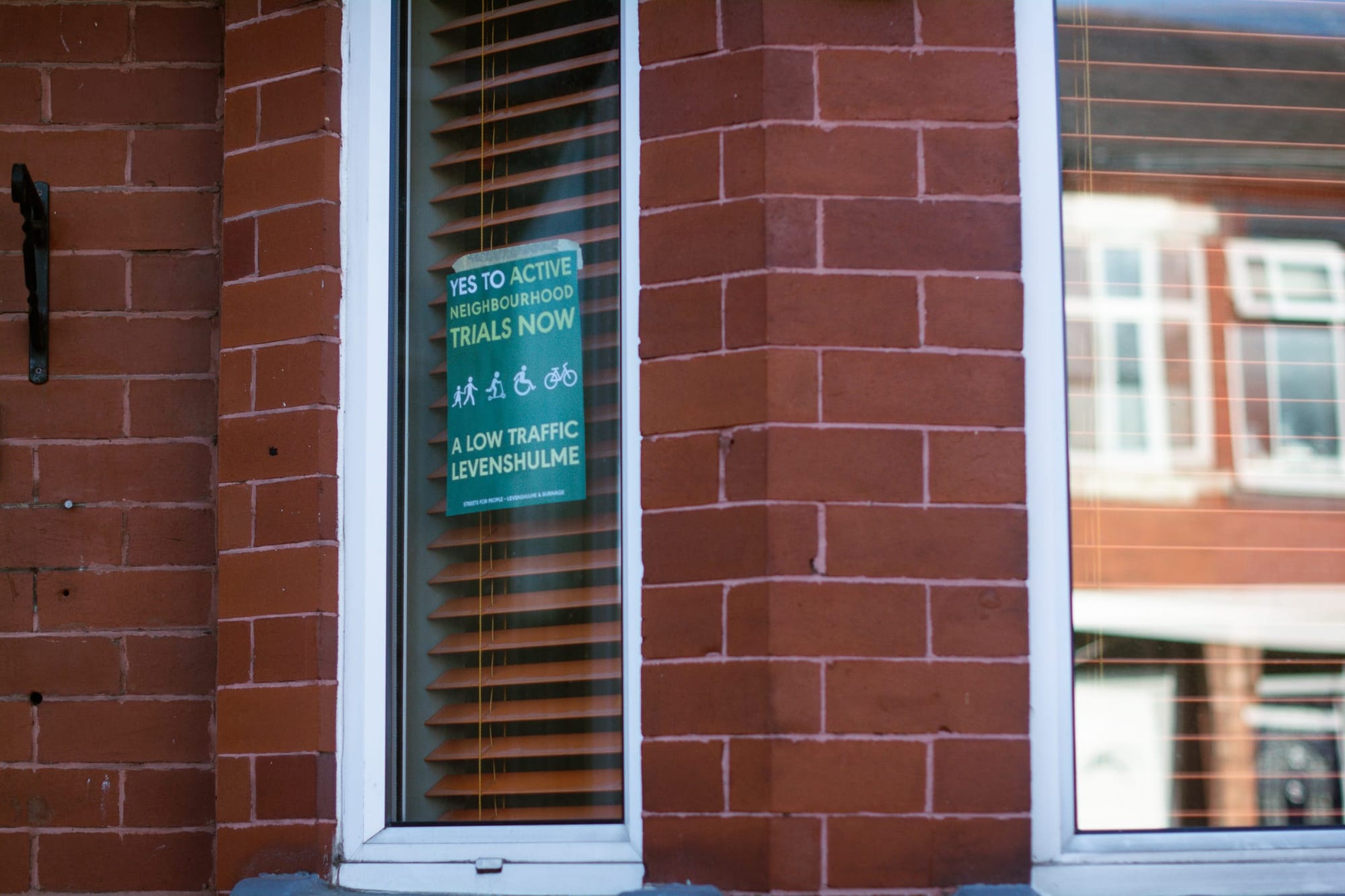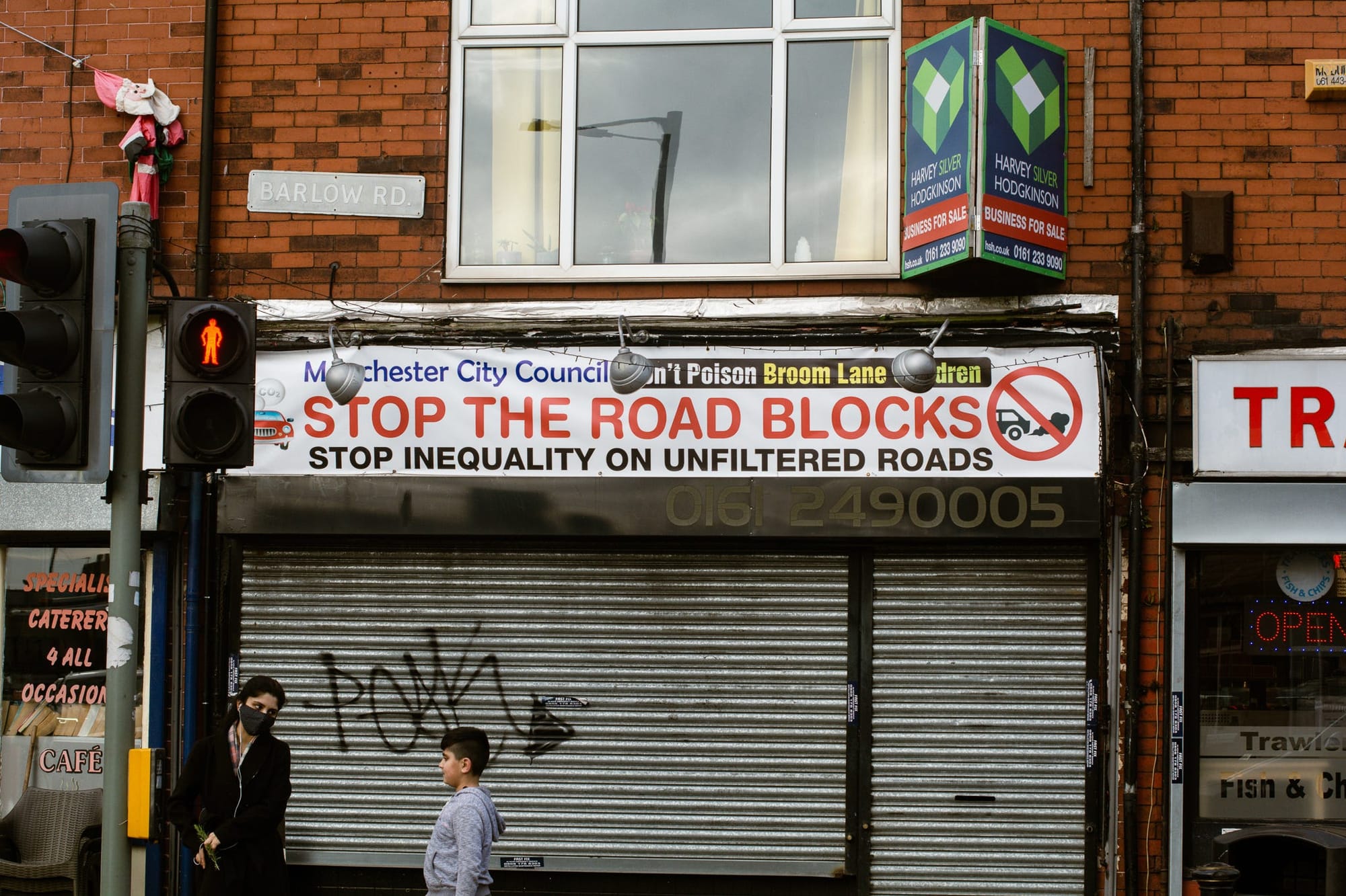 When we visited Levenshulme last week to take pictures and interview residents about the latest developments, we saw plenty of signs attesting to the polarisation caused by the trial. On one abandoned shopfront someone has added a new sign: “STOP THE ROAD BLOCKS” it says. “STOP INEQUALITY ON UNFILTERED ROADS.” A laminated sign nearby says “Cul-de-sacs for the few” and “Say no to road blocks”.