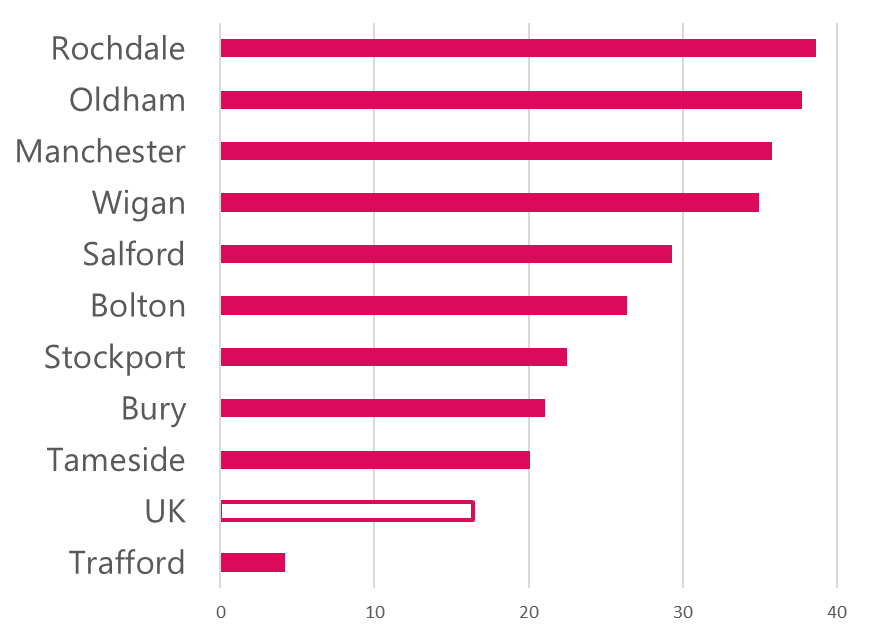 The numbers: We’ve been looking at the numbers provided by the Home Office. They show that across the UK, there are roughly 16 asylum seekers receiving support per 10,000 population. But in Rochdale, Oldham, Manchester and Wigan, the figures are double that. Only Trafford is supporting a lower rate of asylum seekers than the national average. This appears to be a direct result of the government’s policy of housing asylum seekers in low-cost hotels in less affluent areas.
