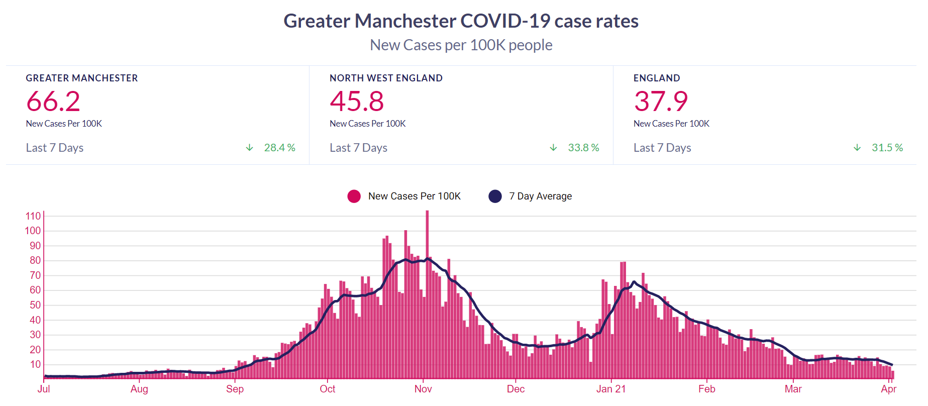 • Covid-19 update: Case rates are falling faster and faster by the day. The Greater Manchester rate is now 66.2, down 28.4% on last week. That’s the lowest level we’ve seen since last September. The rate across England is 37.9, down 31.5%. The latest hospital and vaccine numbers were in yesterday’s briefing.
