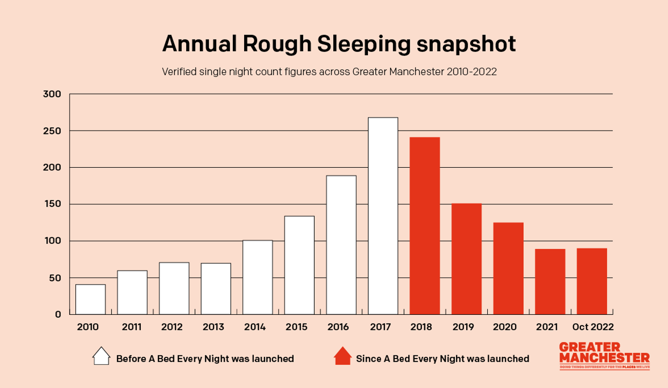 The numbers: A count last month identified 90 people sleeping rough across GM. That’s one higher than last November’s 89, although we will have to wait to get the official annual count, which is always done in November. It may show the first year of rising rough sleeping since 2017, although the figures should be taken with a pinch of salt because many experts don’t think they reflect the full picture.
