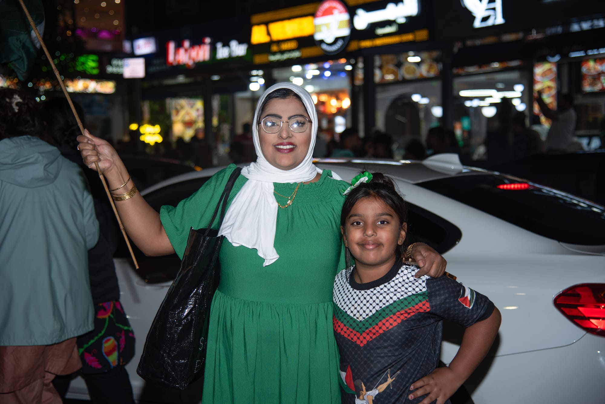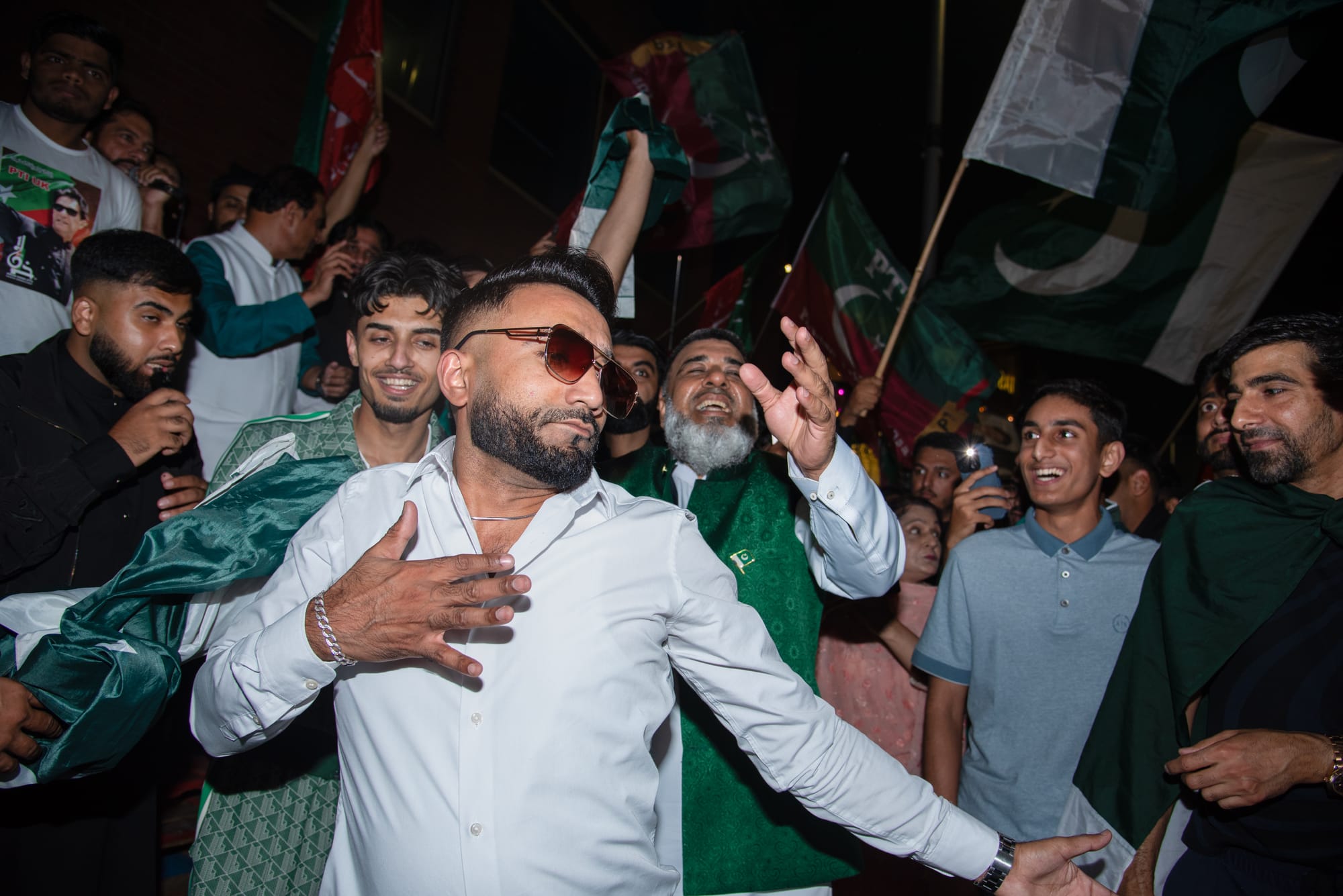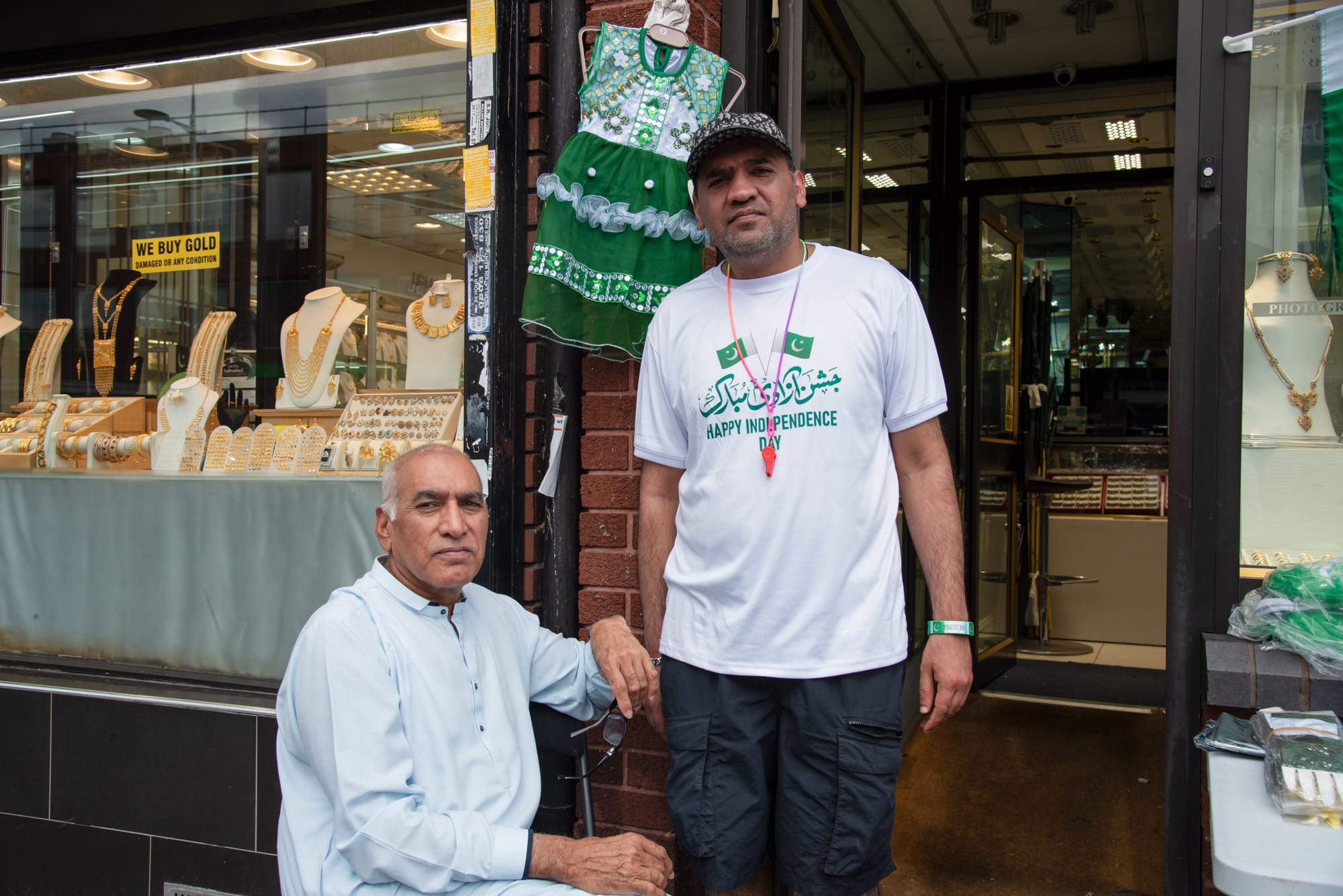 But Wilmslow Road, when I get there, is the green and white of the Pakistani flag. There are green and white scarves, hats, football kits, green and white street-carts selling all of the above. It’s only afternoon, but the signs of the evening’s Pakistani Independence Day celebrations are starting to emerge. Mohammed and his father Shabir sit out on the street by a table covered in pin-badges and light-up sunglasses, and bask in the August heat, Mohammed in a Pakistani Independence t-shirt, his father in a light blue Pathani kameez. The pair, from Lahore originally, have set up a stall in the same spot every Independence Day for the last four years. Mohammed tells me that the street has changed even in that short time, that the demographic of the Curry Mile has become increasingly Middle Eastern. “But if you come here for the celebrations tonight, you will know that the Pakistani community is still alive.”