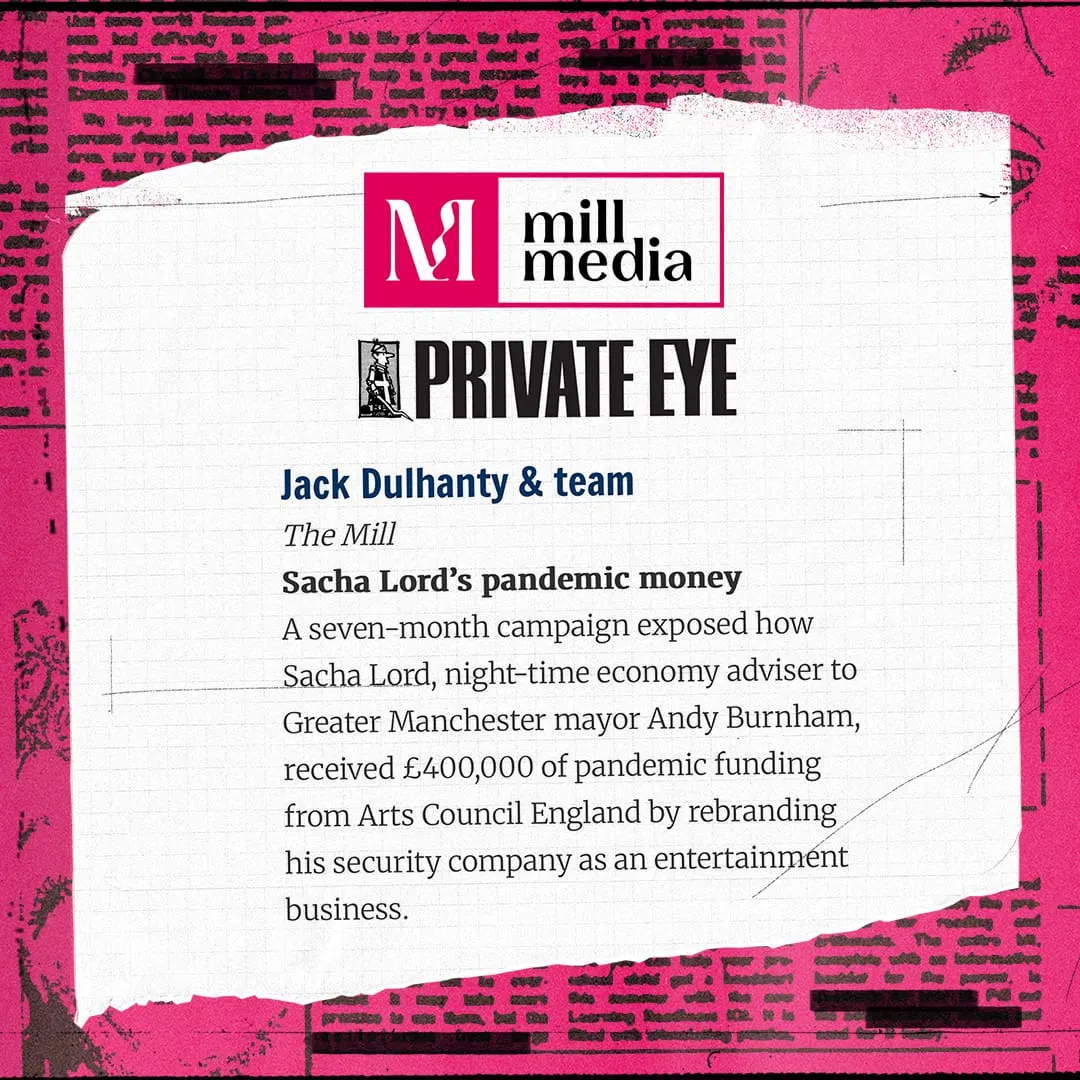 We've never had a story listed for this award before, which usually goes to major investigations from the national newspapers and whose judges this year include the FT's Janine Gibson and Guardian columnist and former Times editor Sir Simon Jenkins. Amazingly, it wasn't the only Mill Media story to be long listed: our sister publication The Post in Liverpool is also on the list for its work on the Big Help charity group. The winner will be announced in Private Eye next month.