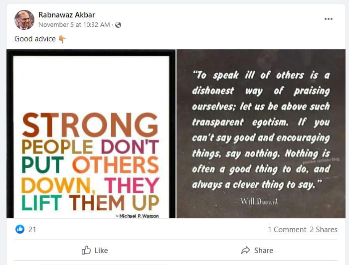 Councillor Akbar told us he was not able to comment on the story but he is said to have told friends that the allegation against him has been entirely invented and will be proven false. On November 5th he posted two graphics on his Facebook page. “Strong people don’t put others down, they lift them up,” one said, and the other begins: “To speak ill of others is a dishonest way of praising ourselves.”