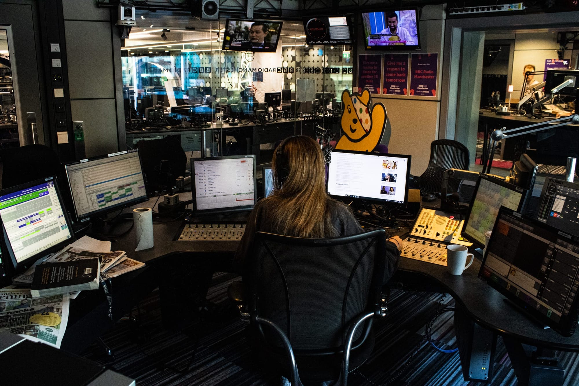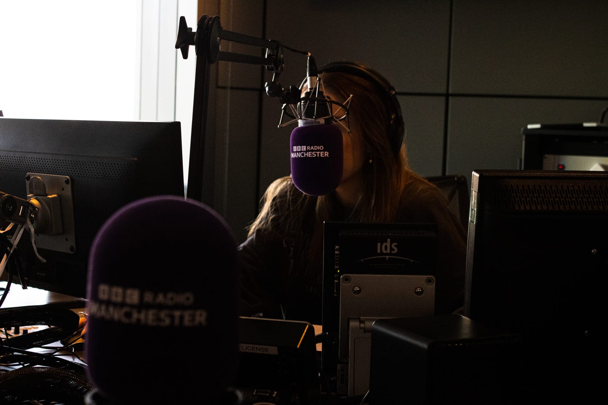 Radio Manchester is just a small corner of the operation, two studios and a few rows of desks. Jameson stays in her studio for the full four hours of the show, with a sports presenter and newsreader going in and out of the other.