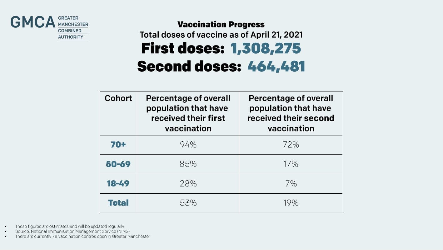 - Vaccinations: 72% of over-70s in Greater Manchester have now received their second vaccine doses, and 464,481 people have overall (which equates to 19% of adult residents). See all the vaccine numbers in the graphic below.