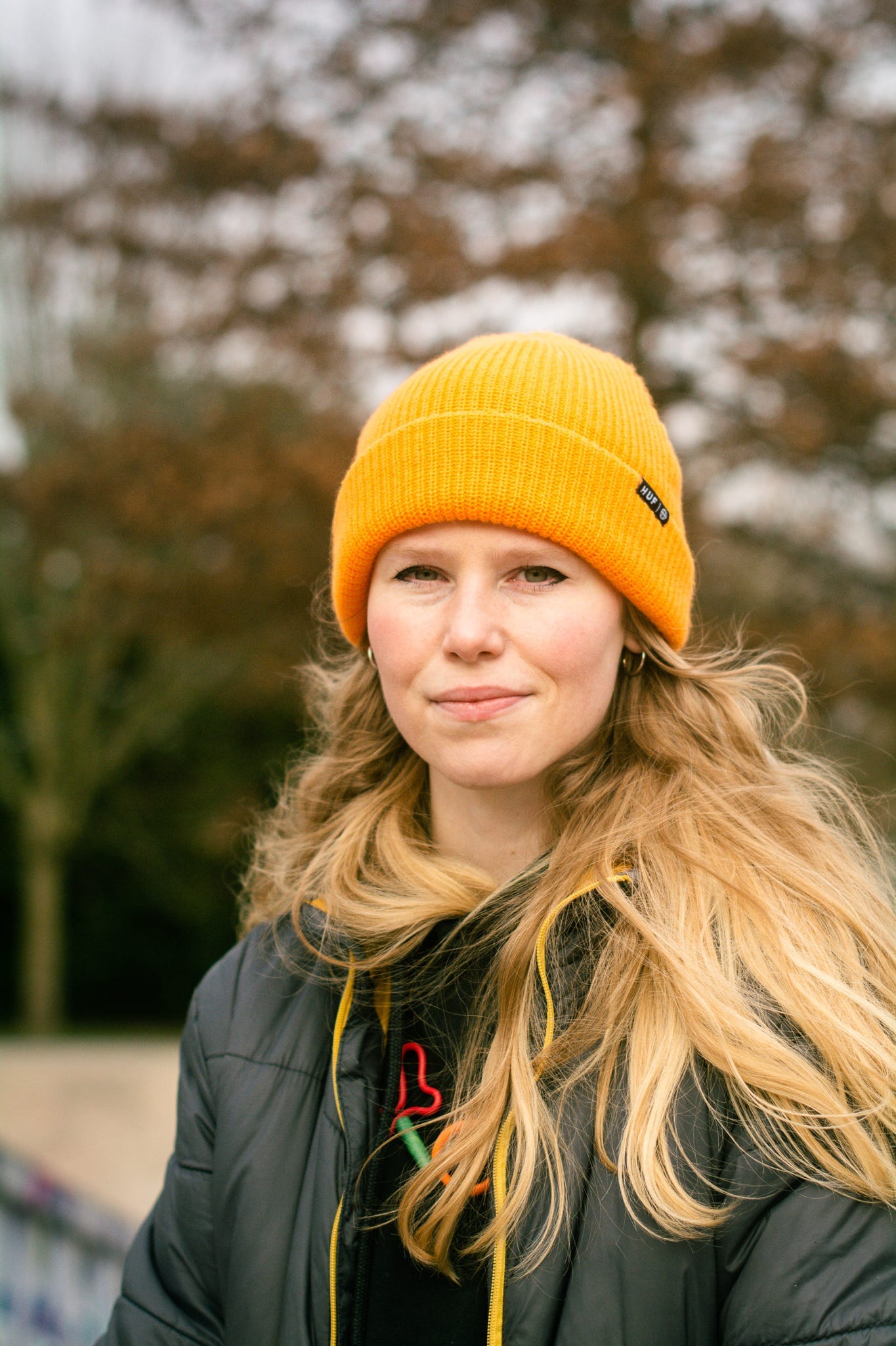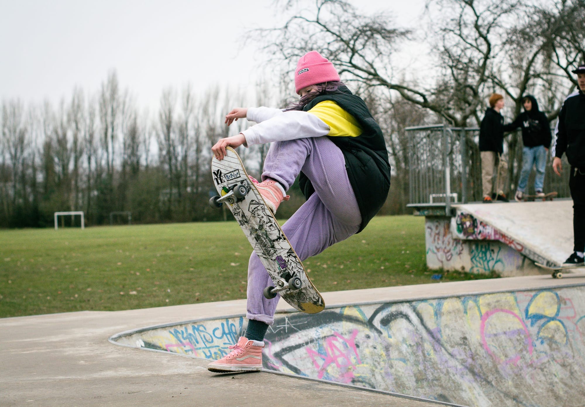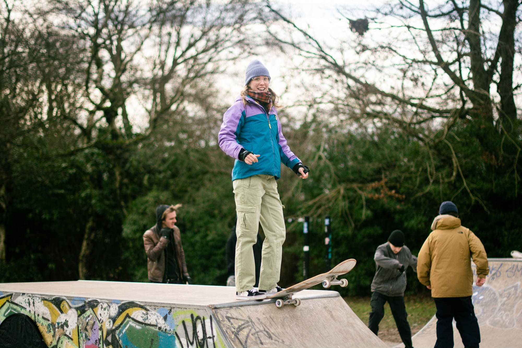At Seymour Park in Stretford, Charlotte, 28, and Charly, 30, are two of the hardy skaters who have ventured out today. Behind the skatepark, parents stamp the ground in an attempt to keep warm as their children kick a football across rain-softened grass.