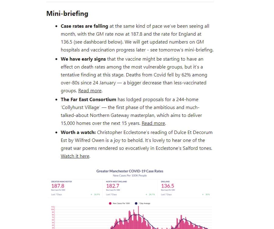 What members get: On top of being the patrons of a new approach to quality local journalism, our members receive three members-only newsletters from us every week. Each one starts with a mini-briefing summarising a few important local stories (example below), followed by a piece of in-depth reporting.