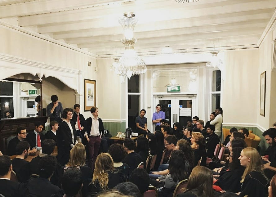 The dinner hall is laid out with three long vertical tables for the students, and a top or high table set horizontally. In all student halls, there are BNOCs or ‘big names on campus’ — usually the popular students, like DJs with big Instagram followings. In Slems the ‘big names’ are elected. The JCR (Junior Common Room — an Oxbridge term for an elected student body which organises events) aren’t necessarily popular, but they’re well known and they wield power. And at dinner, they sit at the top table.