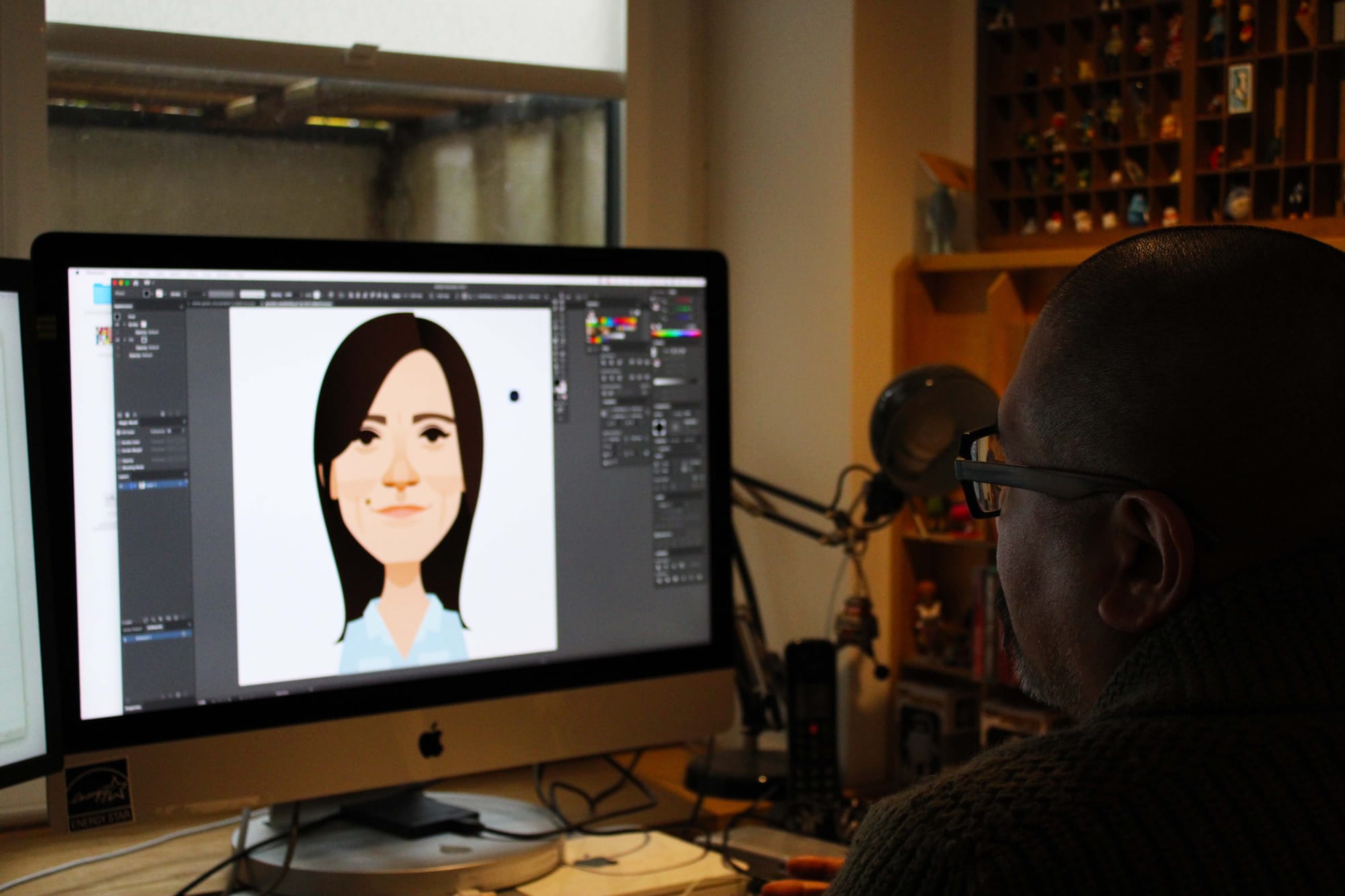 There are bookcases crammed with vinyl records, boxes of more records on the floor and low couches scattered with cushions printed with his artwork. Across the hall is his office, and in the room beside that, his assistant, Dom, is working at a large drawing table.