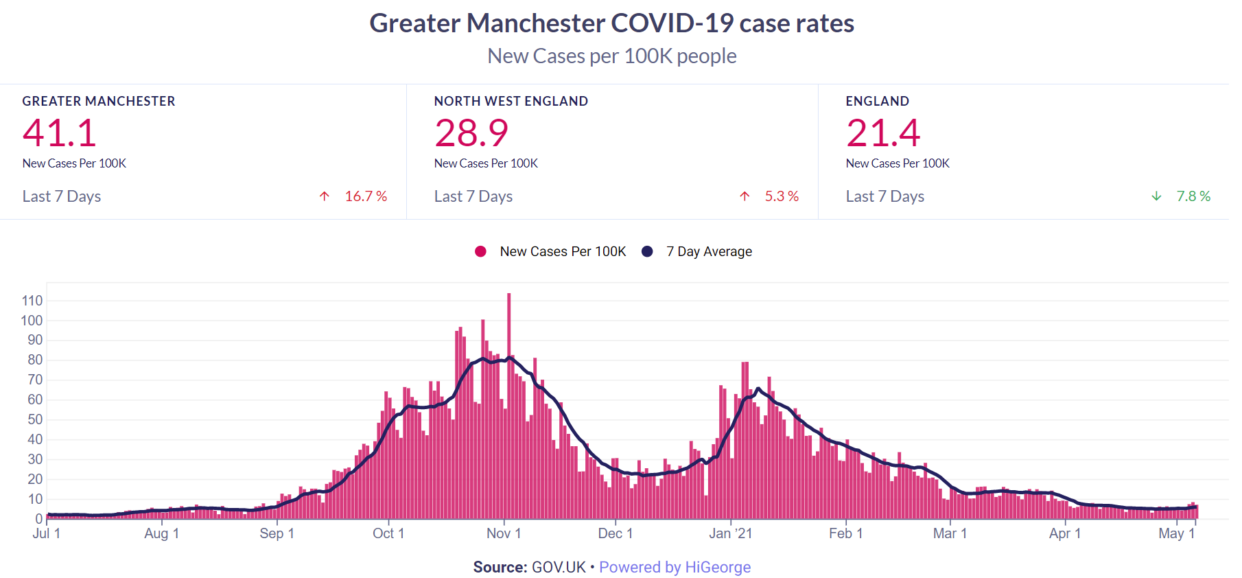 - Cases: The Greater Manchester case rate is now rising again, up 16.7% over a week to 41.1. That movement is primarily being driven by lots of new cases being detected in Bolton, where a round of surge testing is under way and the case rate is up above 100 again. The rate across England is 21.4, down 7.8%. See our dashboard below.