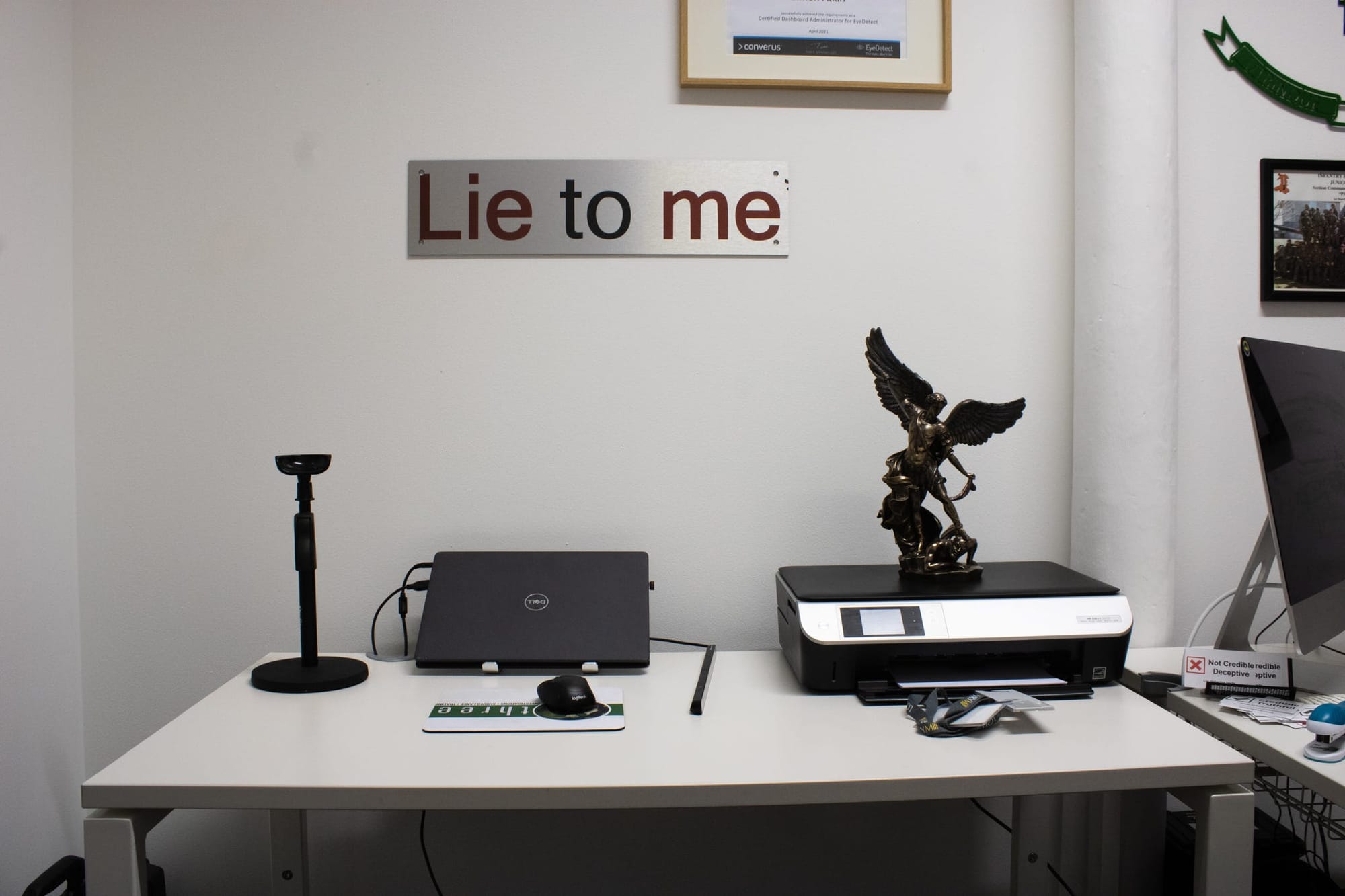 Simon Atkin’s office is very small. A single cubicle that contains an entire company: XThree Surveillance Ltd. Atkin, on the other hand, is not small. An ex-paratrooper, his wide neck is obscured only by a wider beard. When he sits at his desk, a gold statuette of Pegasus sits to his right. Bolted to the wall above his lie detection equipment, in red and black lettering, are the words: Lie to Me.