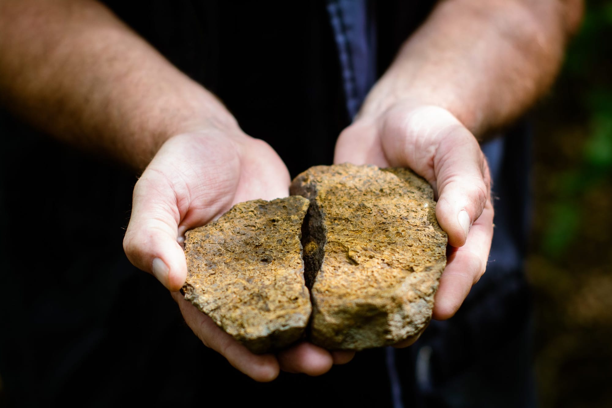 Mick tells us that because of pollution, the water used to run “all sorts of colours,” but efforts to clean it up over the years have been rewarded. “It’s full of trout. Big trout,” he says. The second bag contains something more intriguing. “What do you think that is?” he asks, holding up a brown lump. I make a guess. “Dinosaur poo?” Wrong: it’s a fossilised freshwater mussel bed. The rock is cleaved in half, and he opens it, as you would with a clamshell, to reveal a delicate whorl of patterns inside. “This is where the history of the wood starts,” Mick tells us.