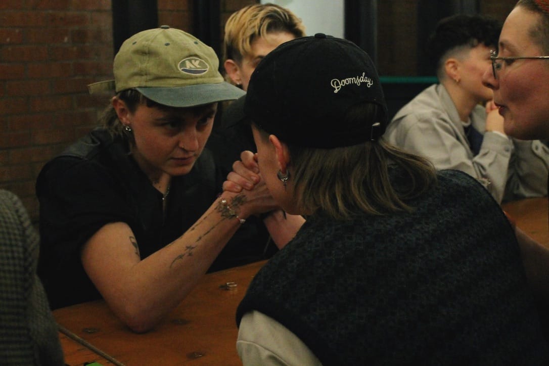 Above all, the trio wanted to set up a night that celebrated dyke culture in all its gritty, silly, chaotic glory: leather, boots, chains, DIY aesthetics, boisterous camaraderie and intimate friendships with exes make for a good night. Whilst Diesel is not specifically for butches, the team found that leaning into butch culture and its stereotypes made for a lot of fun. “There is so much stigma around what butchness is and what butchness means,” Rowan explains. “It’s hated — it’s seen as a toxic masculinity, very stoic and serious”. The butch dyke stereotypes have inspired the night’s signature competitions, which playfully caricature such tropes. The arm-wrestling tournaments always invite a rowdy crowd, eager to cheer on the muscly dykes. Another particularly popular event is the “Muscle Dykes: C*m and Flex For Us”, a campy contest that saw participants opening jars of pickles, lifting their host off the floor and stripping off their leather vests for the muscle-flex showdown, predictably, throwing the room into a frenzy.