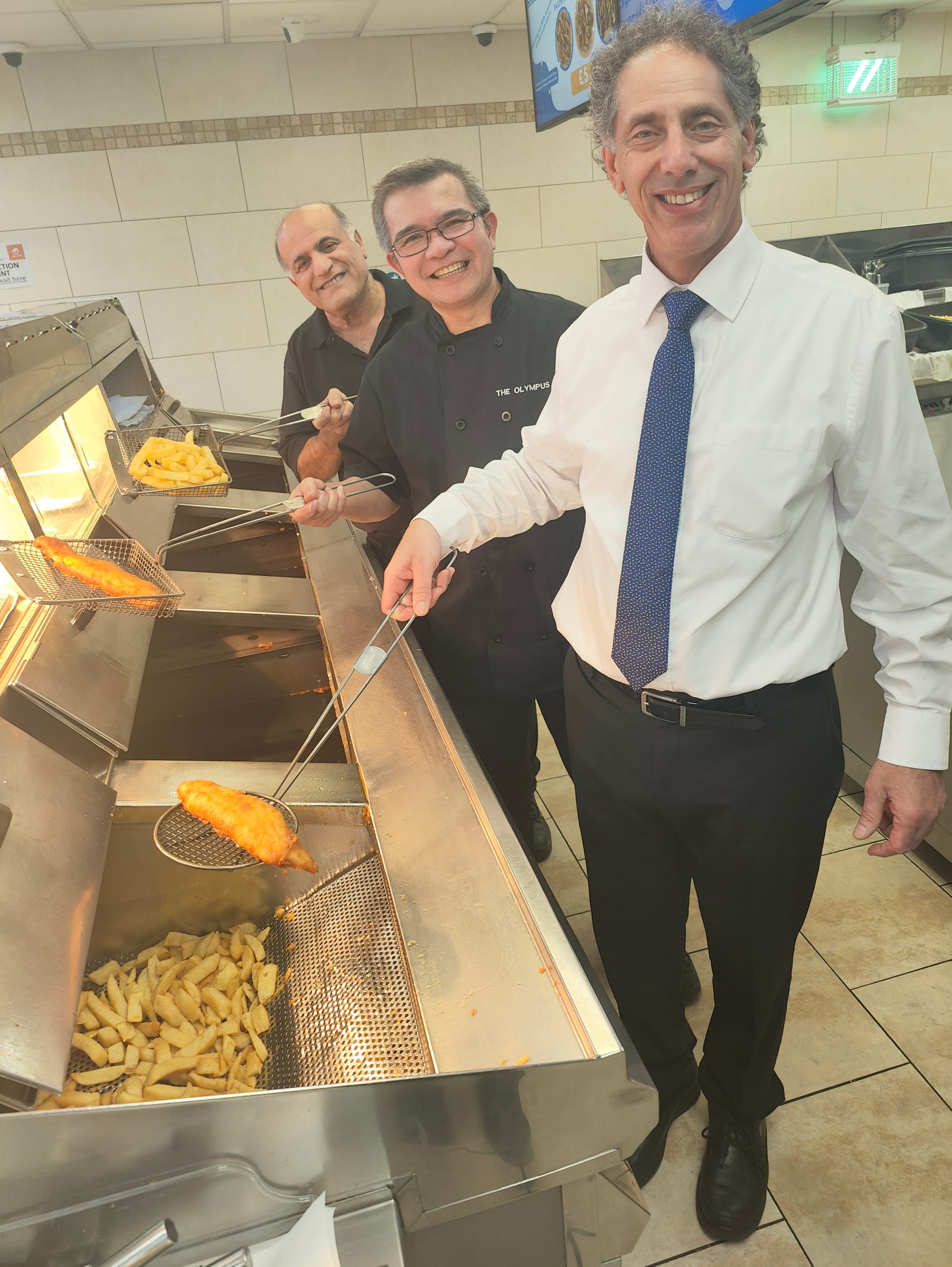 Tasos — a tall, grey Cypriot with permanent shirt and tie, and questioning, probing features — has owned and run Olympus Fish and Chips since its inception in 1988. His eyes and indeed his entire manner have a penetrating intensity to them as he scans his restaurant for the small tasks that, despite the significant team of staff at his disposal, he’s forever on the lookout for: customers in need of welcoming, coats in need of taking, dreg-bottomed teacups in need of collecting.