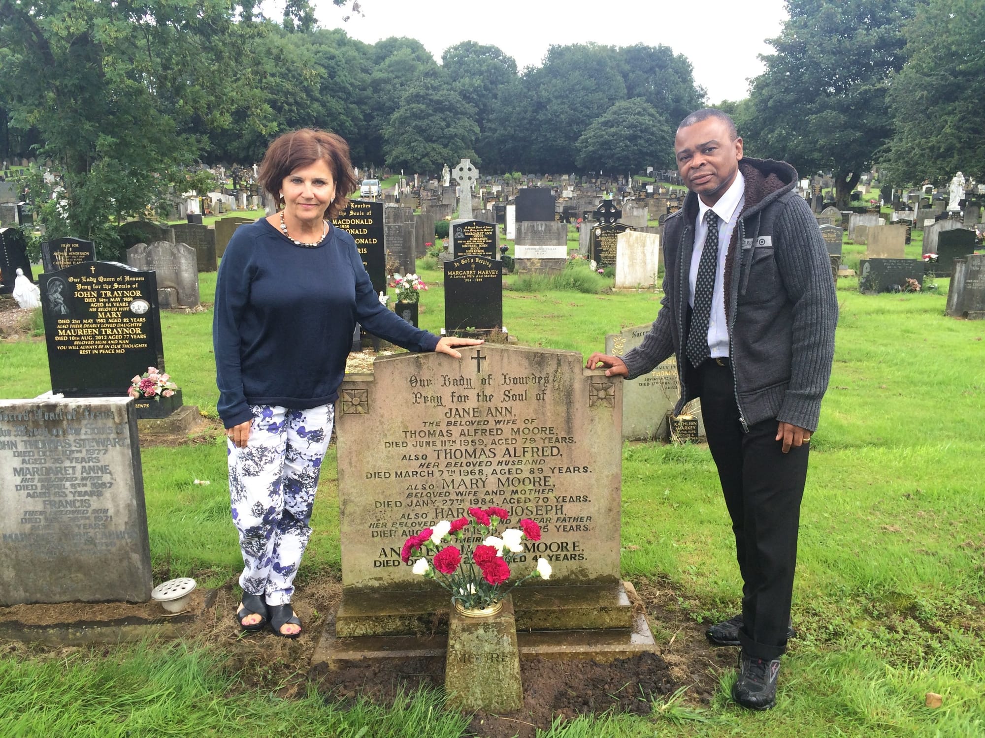 A few Christmases ago, Eddie Moore visited his family’s grave in Moston cemetery. His parents Harold and Mary are buried there, as are his grandparents Jane and Thomas, and his son Andrew’s ashes are scattered there too. The Moores are a Catholic family of Irish descent who have deep roots in Manchester, and the epitaph requests the intercession of “Our Lady of Lourdes”.