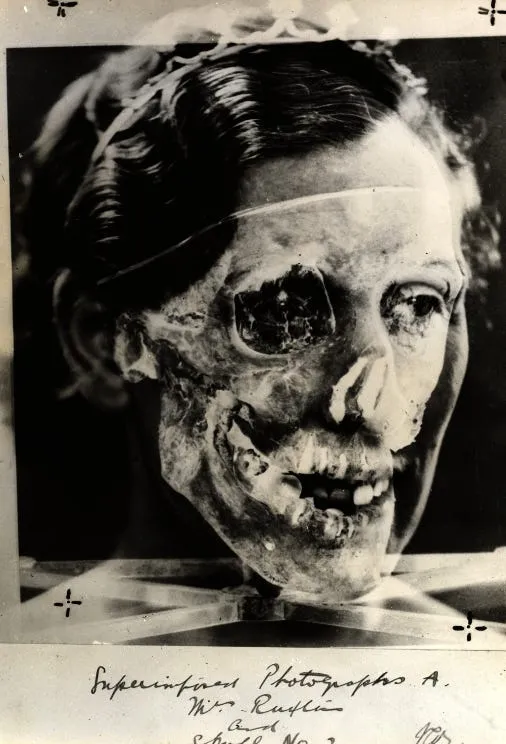 Photo of Isabella superimposed on to photo of one of the skulls. Photo courtesy of the University of Glasgow.
