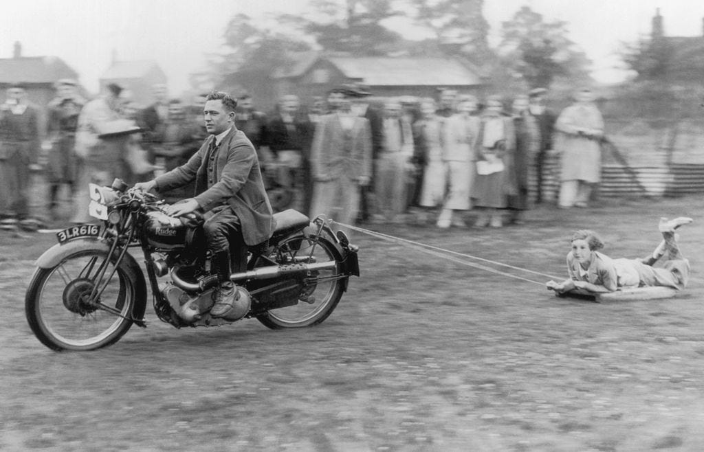A woman grass surfing behind a motorbike somewhere in Manchester, circa 1925. Photo: Hulton Archive/Getty Images.
