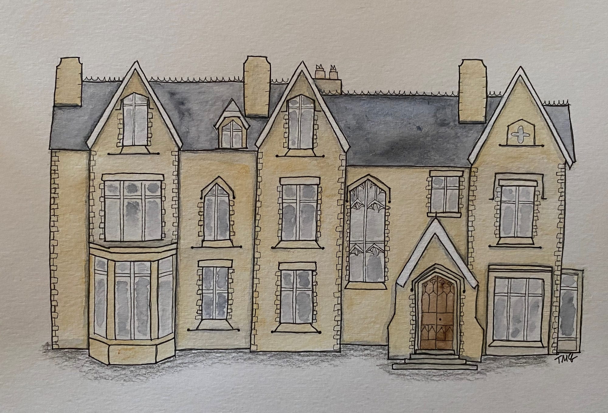 The house is built from pale sandstone rubble in a neo-gothic style. Its eclectic array of architectural features was typical of Victorian houses: Tudor-style hoodmoulds above the windows, gothic tracery on the impressive double-height staircase window, an irregular roofline and canted, rectangular bay windows. Rodgers lived there for a few years, before it was sold in 1867.