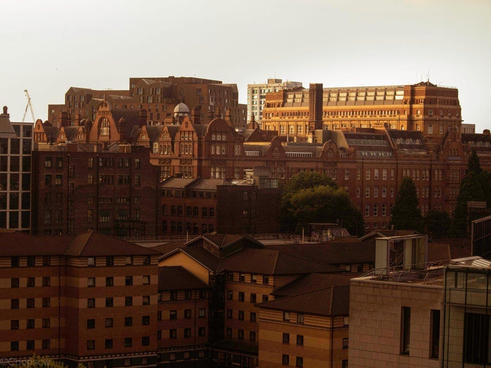 We love this golden hour photo of Manchester. Posted by u/Coopscw on Reddit.