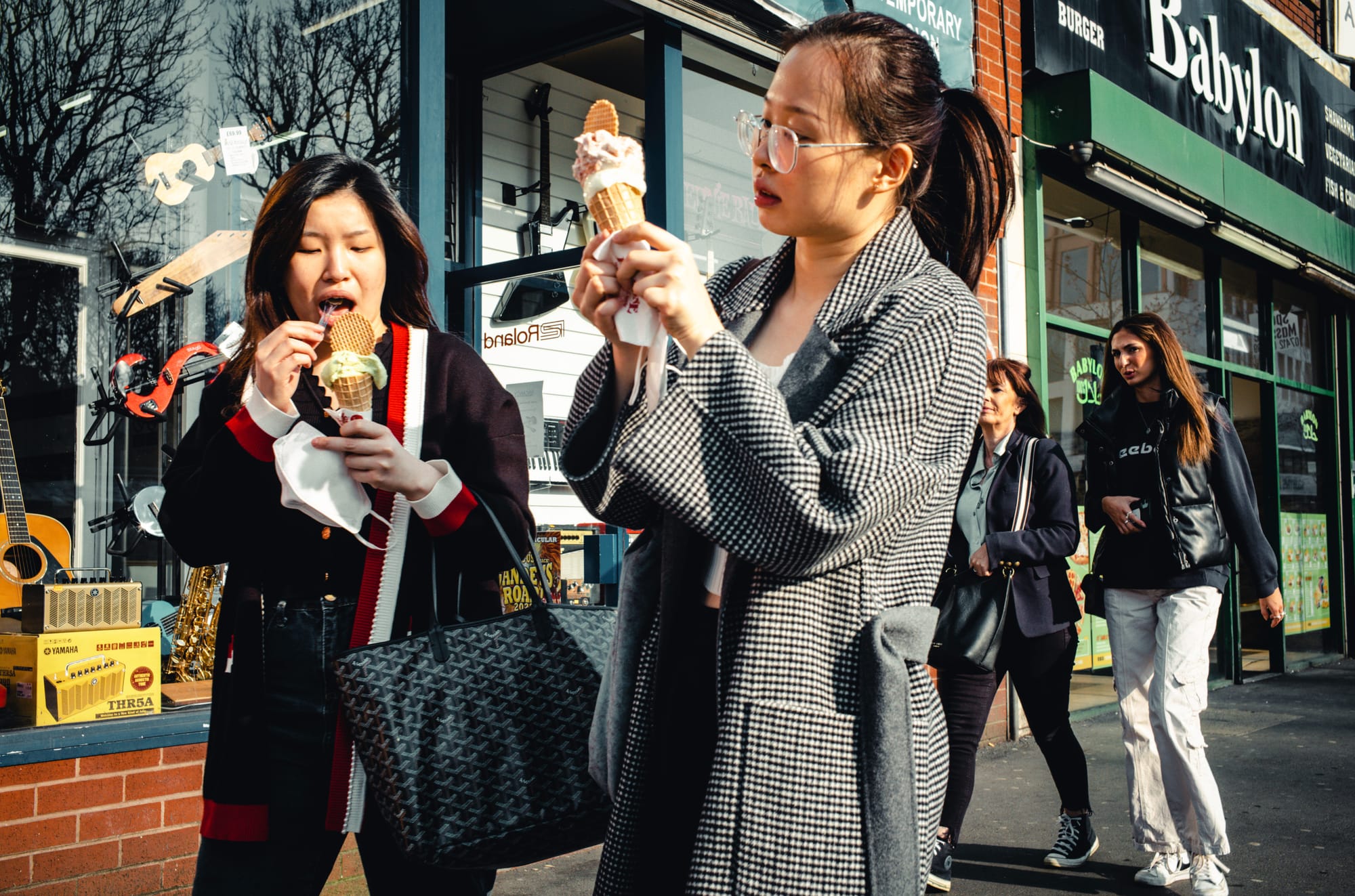 Two women enjoy ice cream in the sun on Oxford Road. Photo Tim Jokl on Flickr.