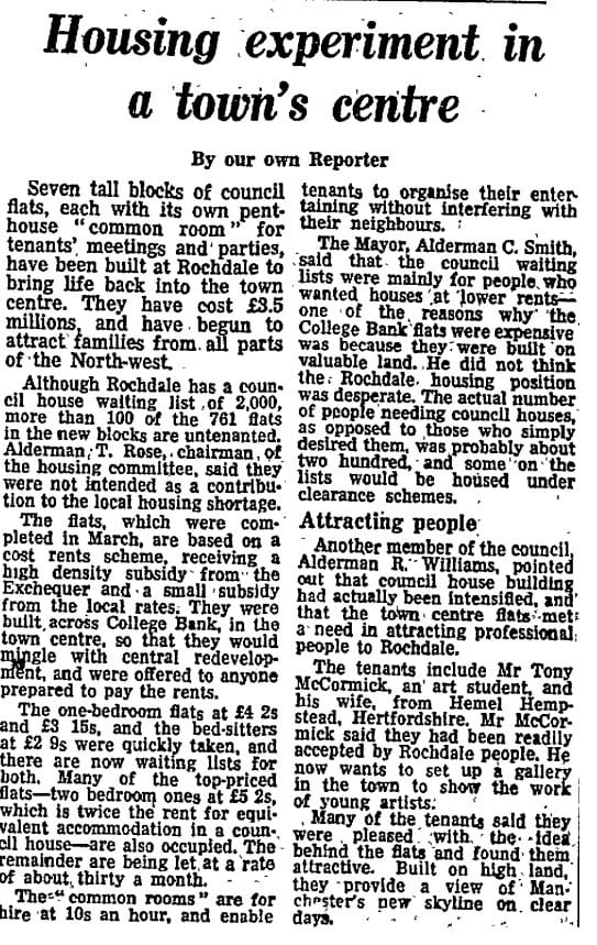 The new blocks were not supposed to deal with Rochdale's council house waiting list, which then stood at 2,000. In fact, they were unaffordable to most of the people on the list, with rents that were up to twice as high as regular council homes. The town centre flats "met a need in attracting professional people to Rochdale," the reporter explains, and were mainly funded by a government subsidy. The tenants included Mr Tony McCormick, an art student from Hemel Hempstead, who planned to set up a gallery in the town and had moved in with his wife.